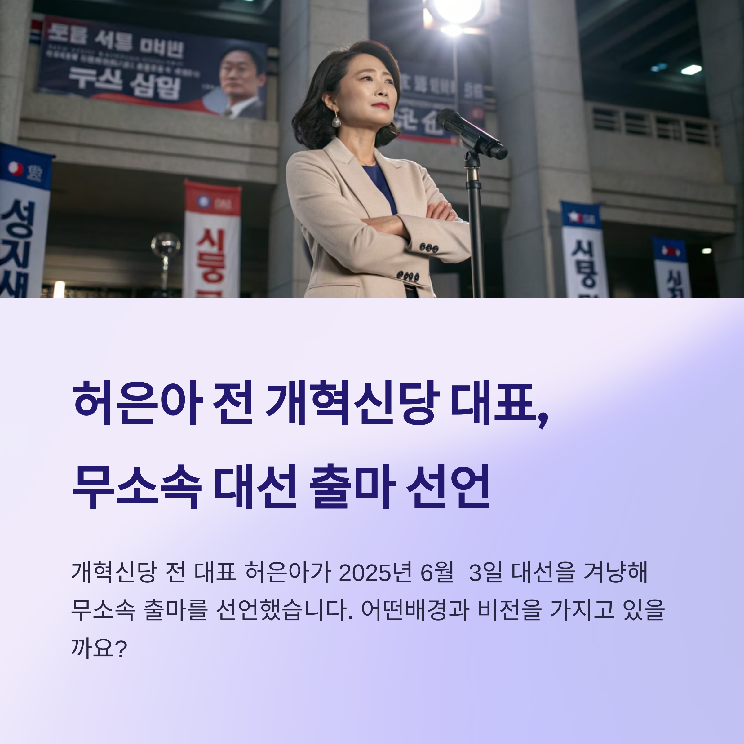 ✔️ 허은아 전 개혁신당 대표는 2025년 6월 3일 대선을 겨냥해 무소속 출마를 선언했습니다.