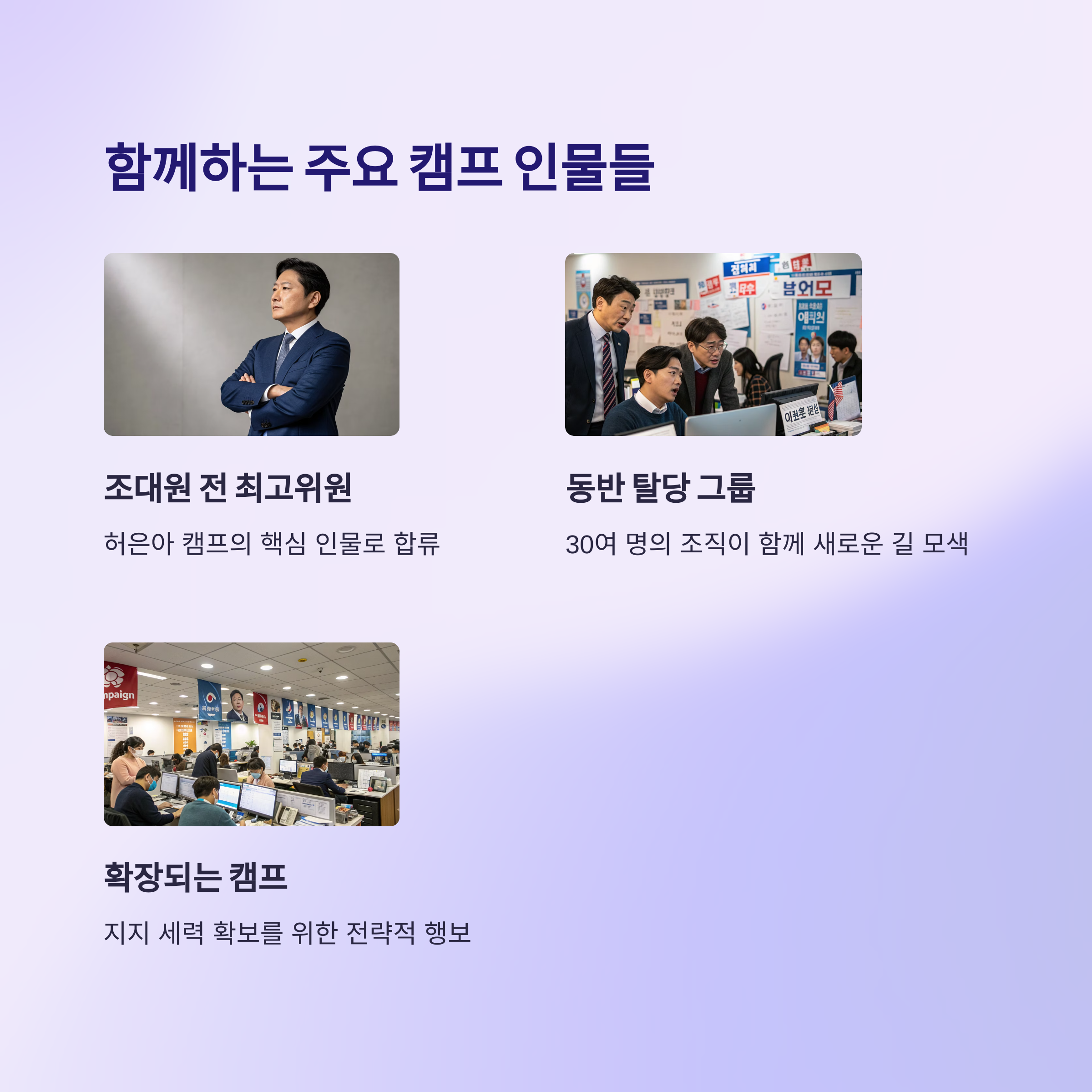 허은아의 캠프는 기존 정당에 속하지 않는 독립적이고 유연한 조직 문화로 구성될 것으로 보인다. 선대위원장으로 합류한 조대원 전 개혁신당 최고위원은 허은아의 핵심 전략가 역할을 담당하며, 그동안의 정치 경험을 통해 캠프의 전문성과 신뢰성을 강화한다. 특히, 비전 발표회 등 허준의 이미지를 활용한 상징 공간에서 열린 행사가 그녀의 "치유와 통합" 메시지 전달에 효과적인 역할을 할 것으로 분석된다.