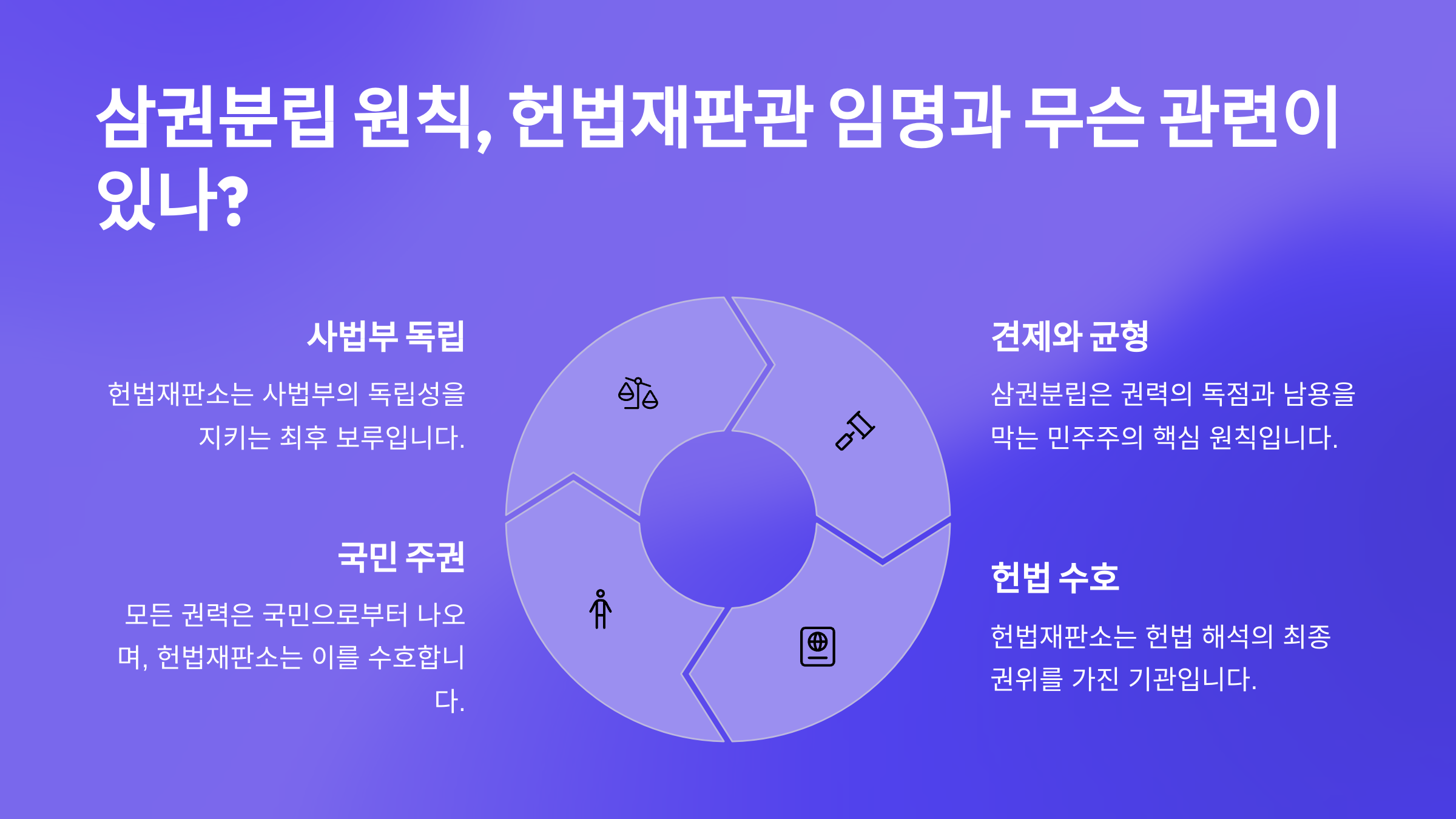 삼권분립은 민주주의 체제의 기본 원칙입니다. 행정부, 입법부, 사법부가 각자의 권한을 독립적으로 행사하면서도 상호 견제하는 구조죠. 헌법재판소는 이러한 삼권 중 어느 한 쪽에도 치우치지 않고 헌법을 수호하는 역할을 담당해야 합니다. 그렇기 때문에 그 구성은 어느 때보다 엄중하고 신중하게 다뤄져야 하죠.