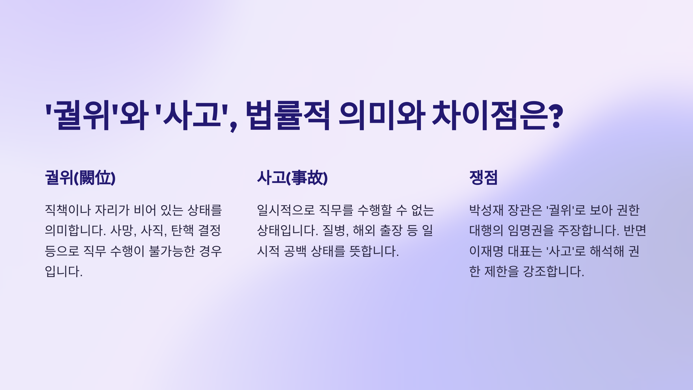 하지만 많은 헌법 전문가들은 이에 대해 회의적인 시각을 드러냅니다. 대통령이 탄핵으로 직무가 정지된 것은 명백히 '사고' 상태이지 '궐위'는 아니라는 것이죠. '궐위'는 대통령이 사망하거나 사퇴했을 때를 말하며, 지금 상황은 어디까지나 헌법재판소의 최종 판단 전까지는 '임시 정지'에 해당된다는 반론입니다. 이 지점에서 법적 해석의 충돌이 발생하며, 임명의 정당성 논란이 커지고 있습니다.