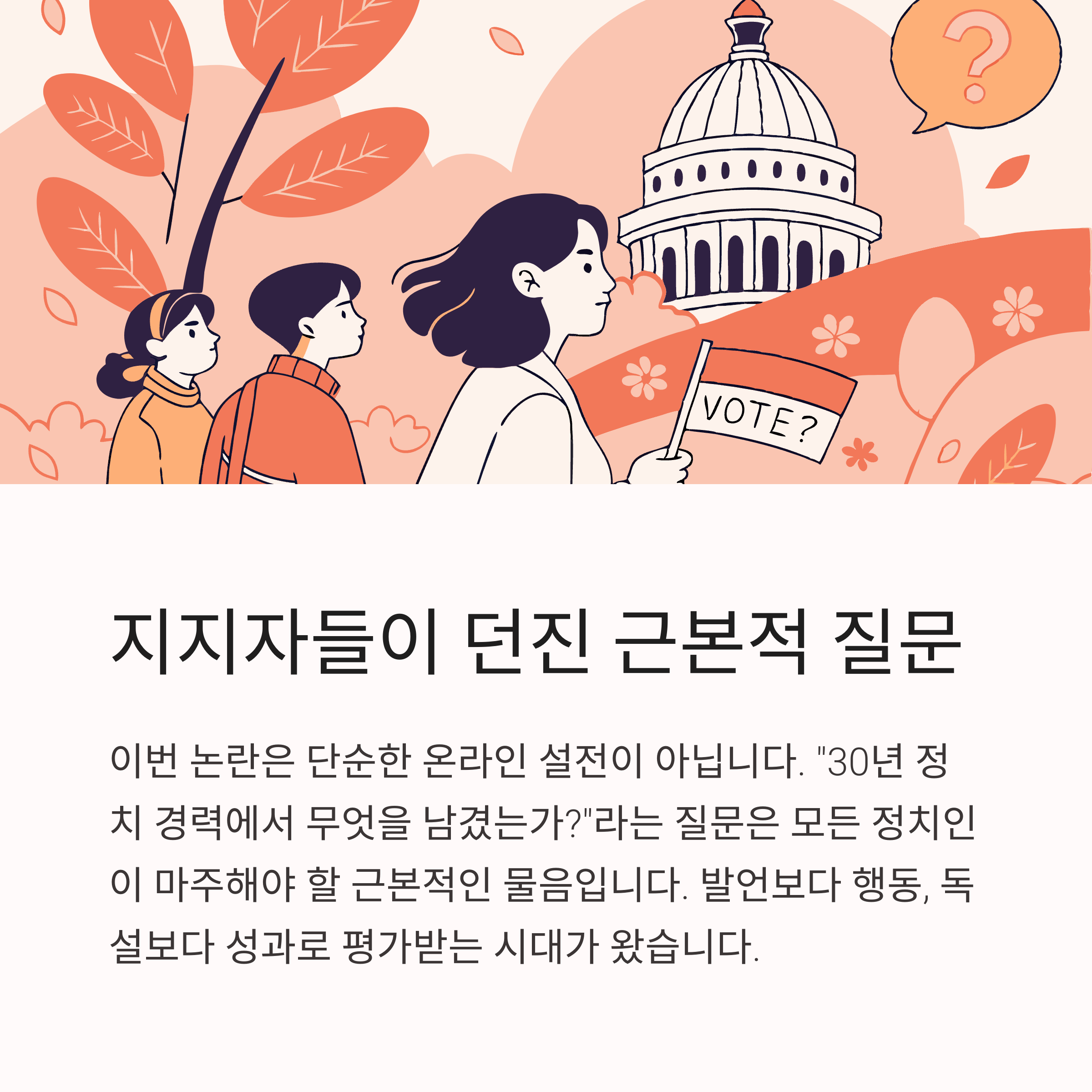 이 사건은 홍 전 시장 개인에 대한 비판을 넘어서, 현재 보수 정치권의 문제를 드러냅니다. 경험과 연륜이 많은 정치인들이 자신을 돌아보기보다, 상대방의 지지 성향이나 나이, 방식 등을 비난하는 경향은 정당 내부의 혁신을 가로막는 요인이 됩니다.