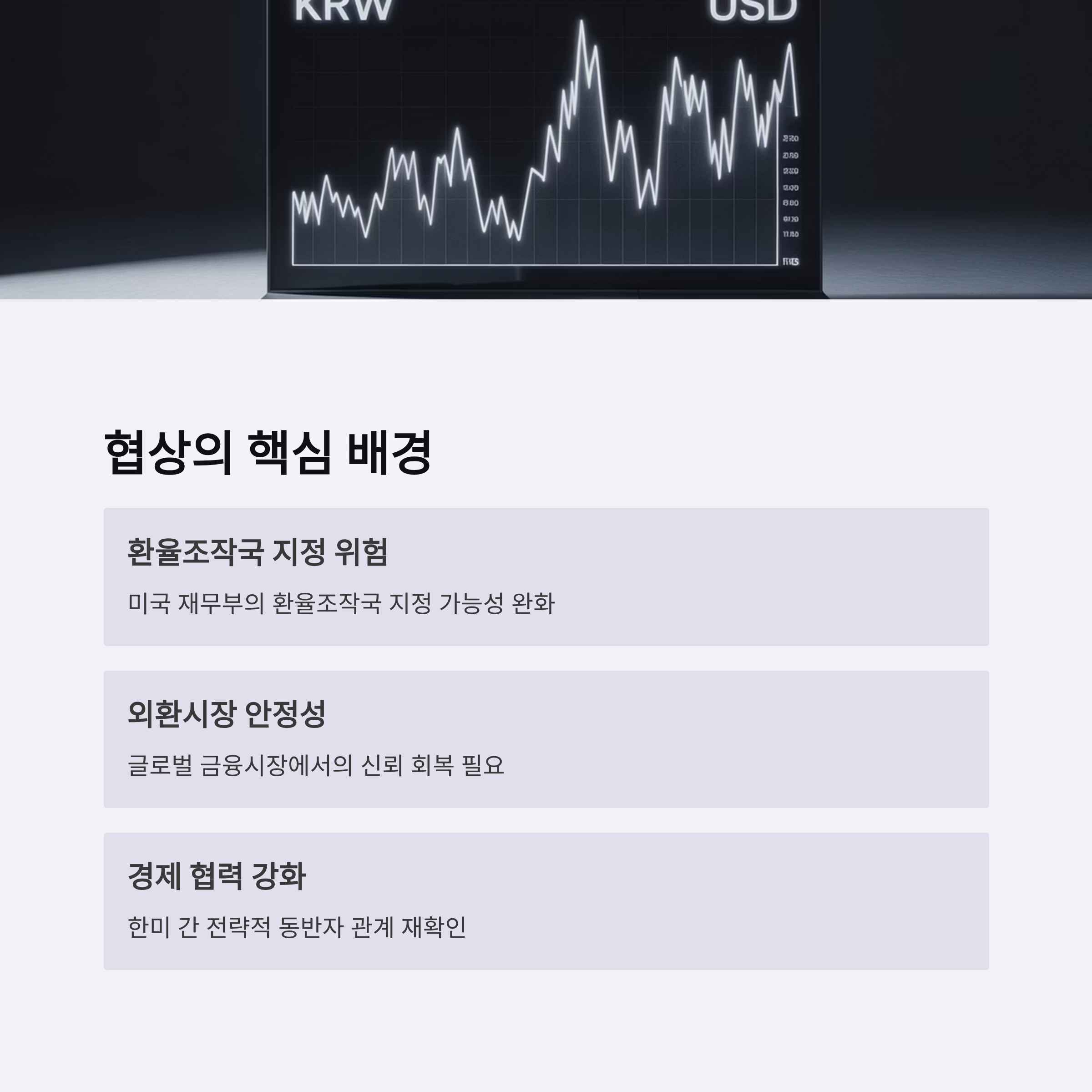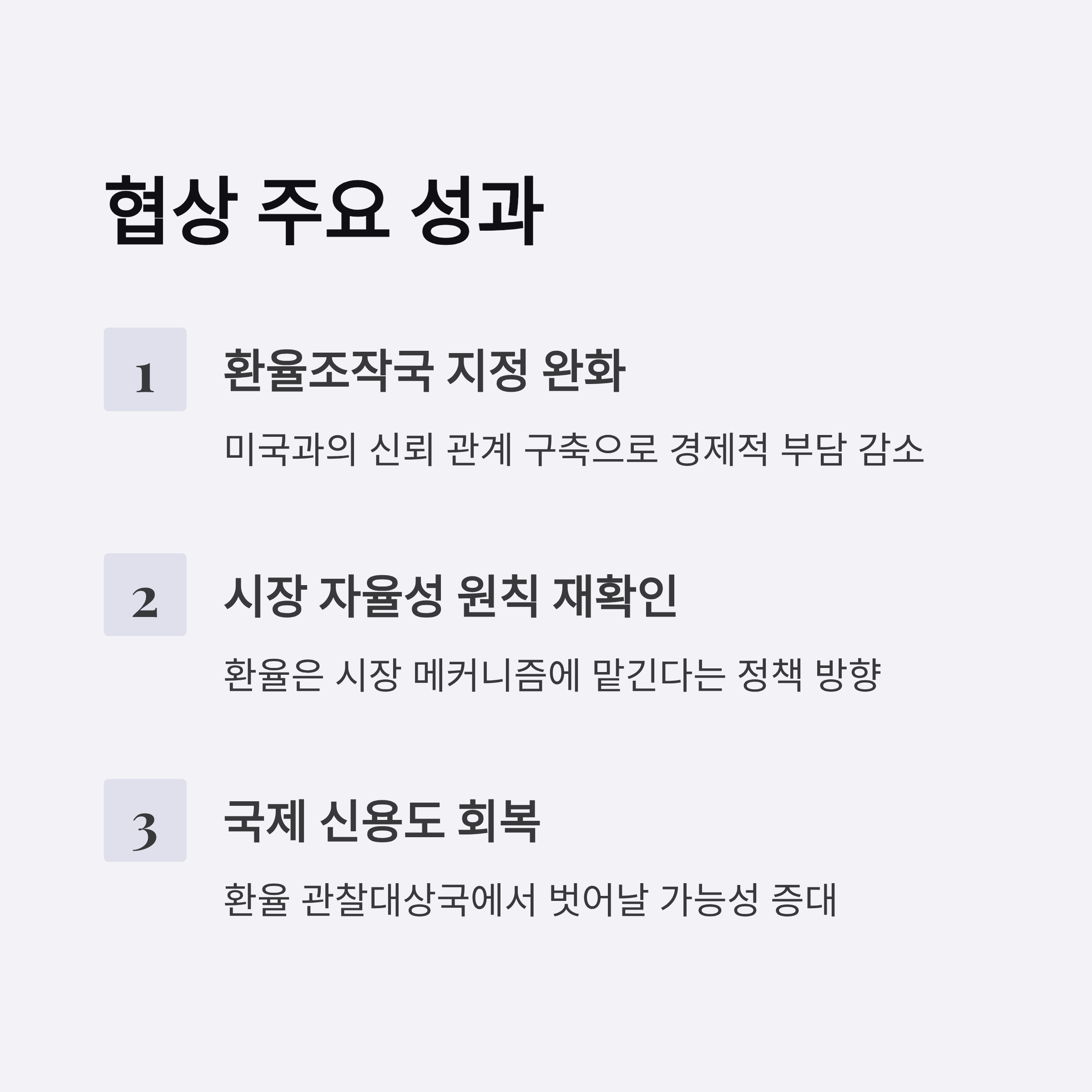 2. 협상은 환율조작국 지정 가능성을 완화하고 외환 시장 안정성을 확보하는 데 초점을 맞춤.