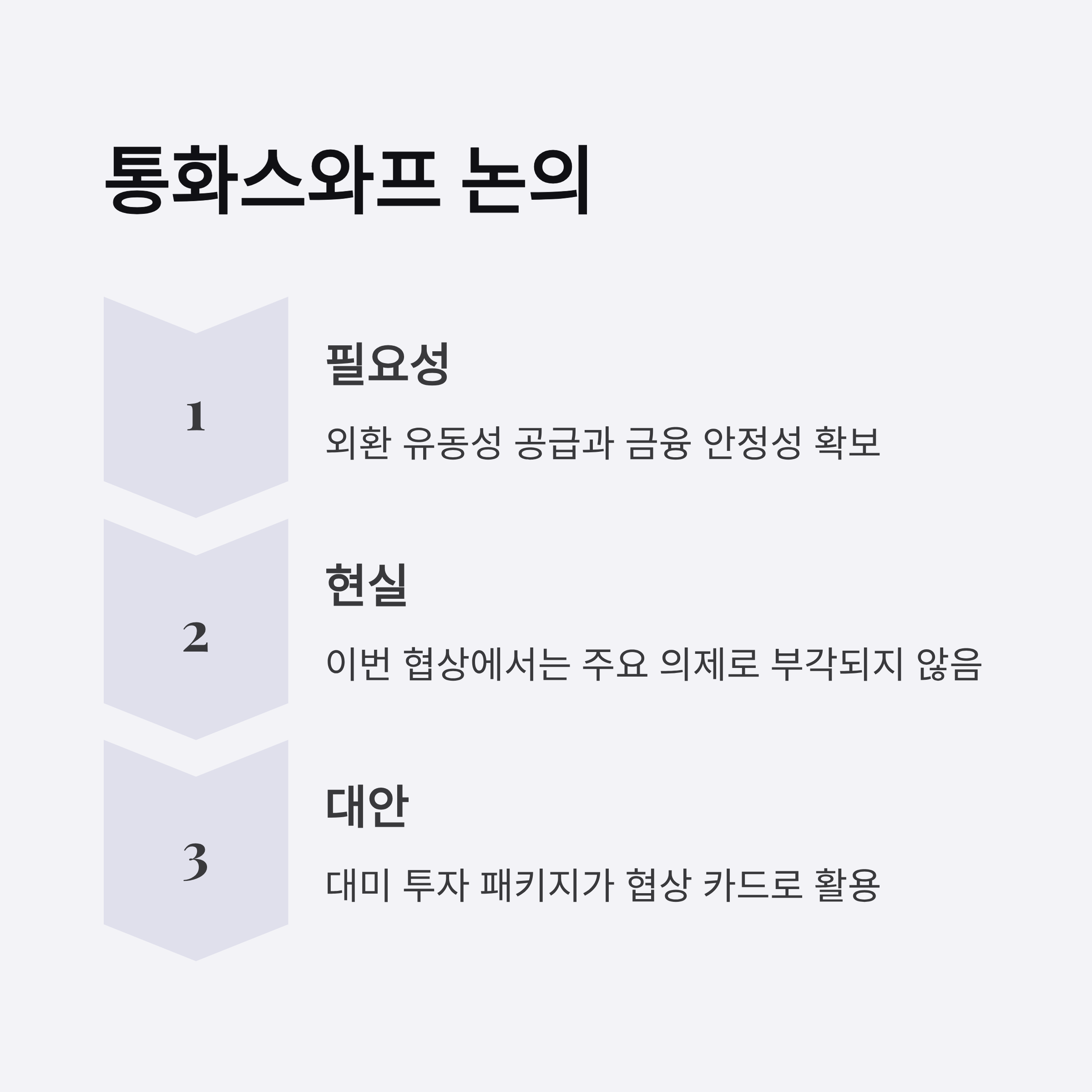 3. 대미 투자 3500억 달러 패키지와 통화스와프 체결 가능성도 논의에 포함됨.