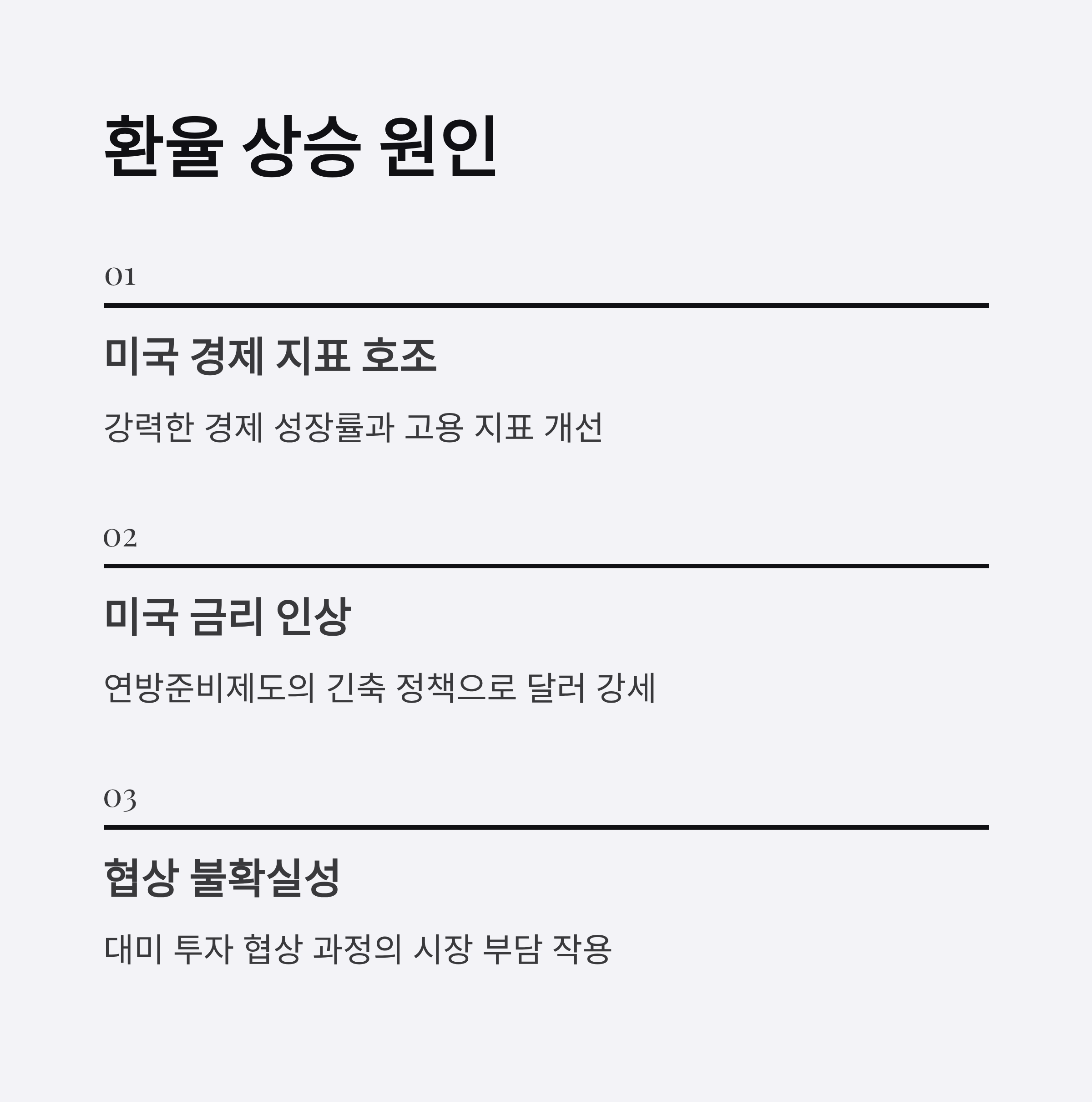 | A. 원·달러 환율 상승은 미국 경제 지표 호조와 금리 인상으로 인한 달러 강세가 주요 원인입니다. 여기에 대미 투자 협상의 불확실성 역시 추가적인 시장 부담으로 작용했습니다. |