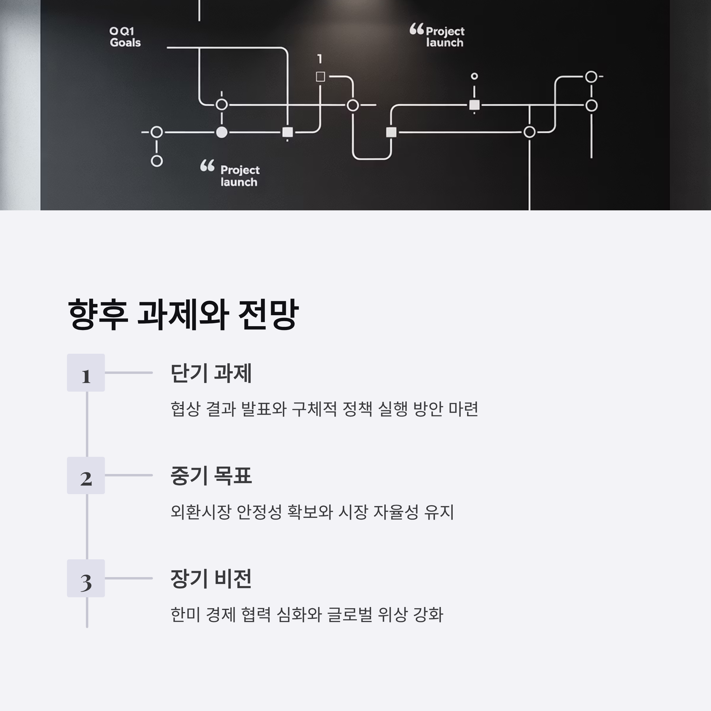 한미 환율 협상은 단순히 외환 시장의 안정성을 확보하기 위한 논의가 아니라, 한국과 미국 간의 전략적 경제 협력의 새로운 장을 열었다는 상징적 의미가 있습니다. 환율조작국 지정이라는 리스크를 최소화하며, 대미 투자 협상과 통화스와프 가능성을 논의한 이번 협상은 한국 경제의 글로벌 위상을 더욱 강화할 수 있는 발판을 마련했습니다. 그러나 대미 투자로 인한 국내 자본 유출 및 통화스와프의 부재는 경제 안정성과 직접 연관된 부분으로 향후 관리가 필요합니다. 한국 정부가 외환 시장에 과도하게 개입하지 않고 시장의 자율성을 유지하며 경제 전반의 안정성을 확보하는 것이 중요한 과제로 남아 있습니다. 지금은 협상 결과의 구체적 발표와 이에 따른 정책 실행을 주의 깊게 지켜봐야 할 시점입니다.
