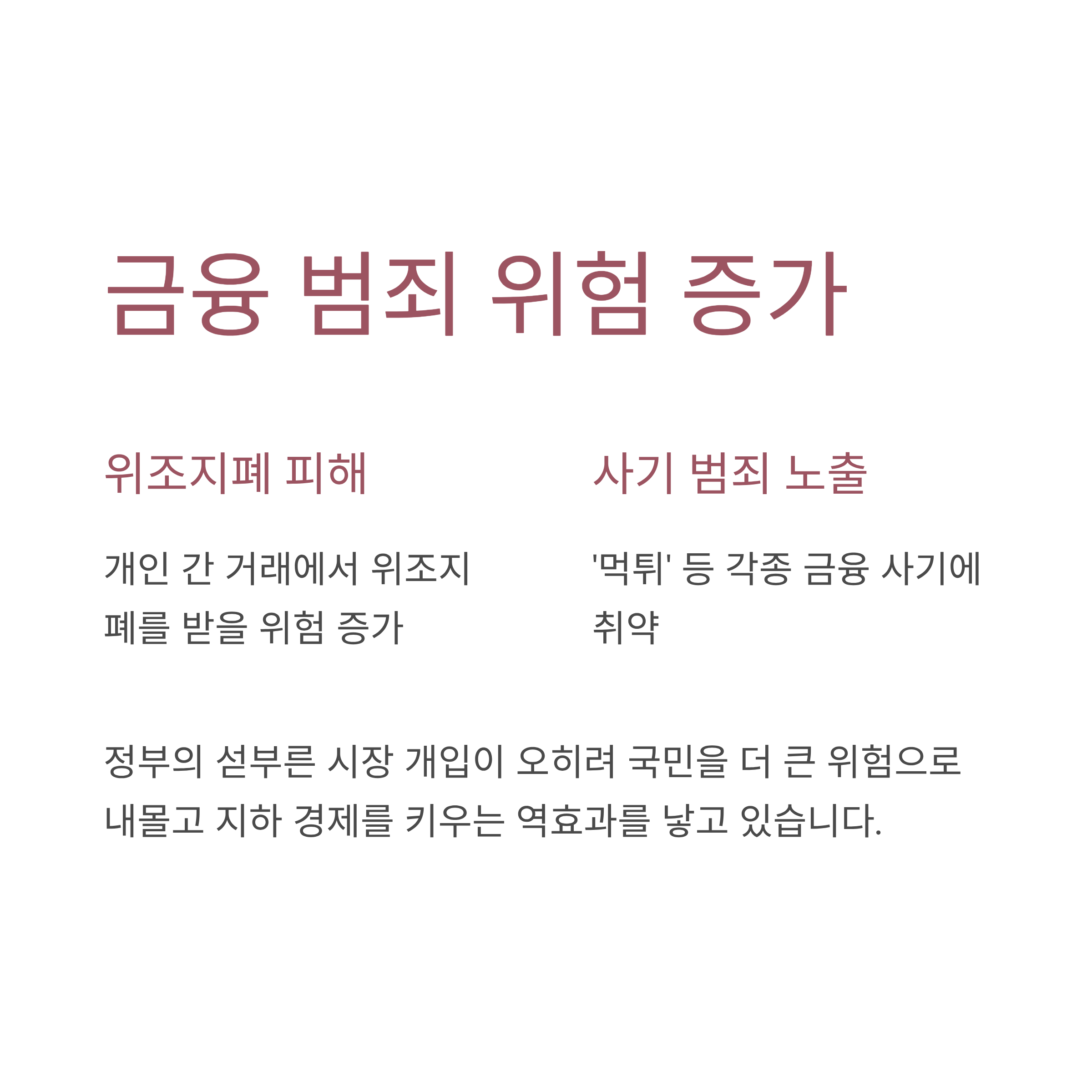 더 큰 문제는 이러한 음성 거래가 각종 금융 범죄의 온상이 될 수 있다는 점입니다. 개인 간 거래 과정에서 위조지폐를 받거나 '먹튀'를 당하는 등 사기 범죄에 노출될 위험이 커집니다. 정부의 섣부른 시장 개입이 오히려 국민을 더 큰 위험으로 내몰고, 지하 경제를 키우는 역효과를 낳을 수 있다는 지적이 나오는 이유입니다. 시장의 자율적인 기능을 억압하는 정책은 언제나 예상치 못한 왜곡을 낳기 마련입니다.