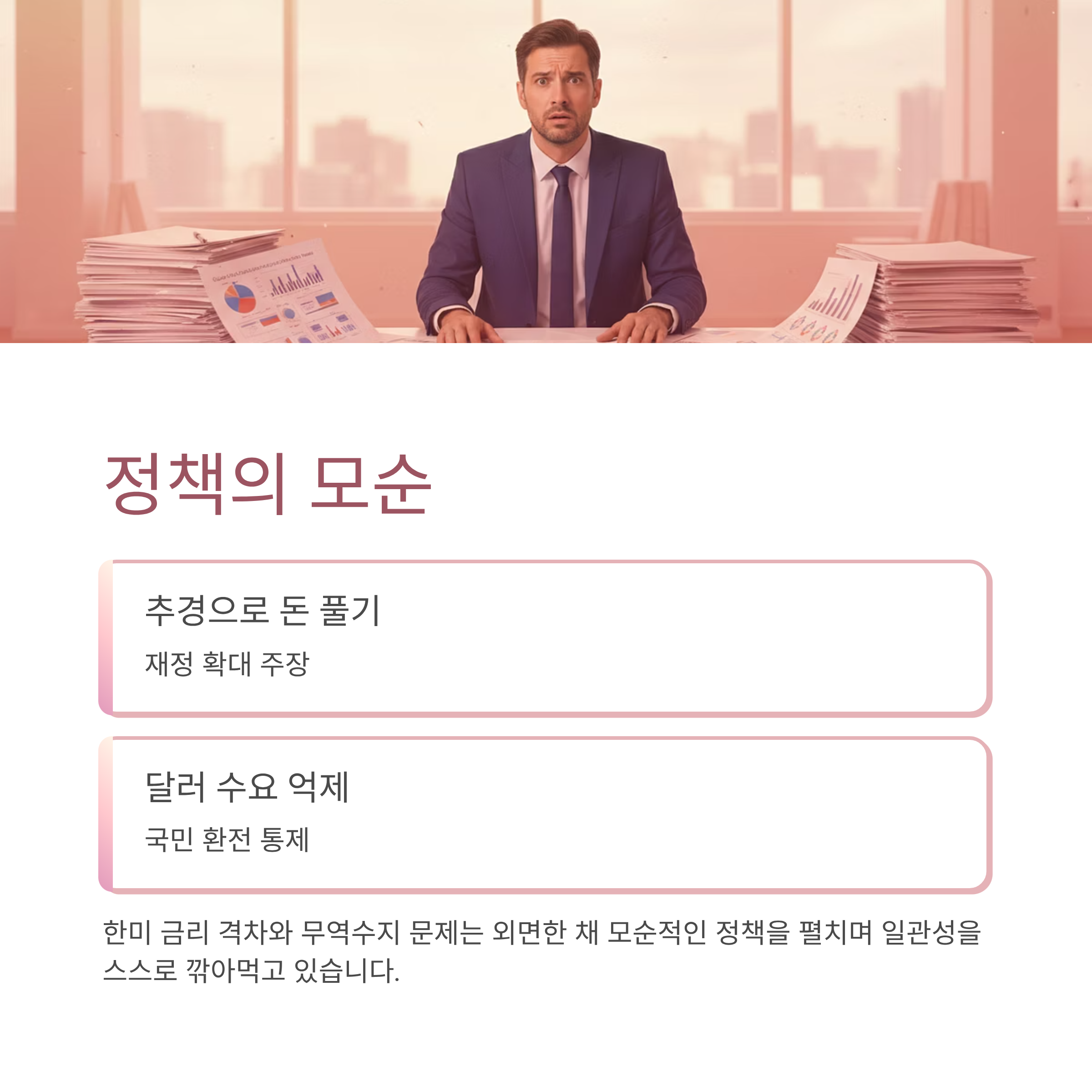 또한, 구두 개입, 기업 압박에 이어 일반 국민까지 옥죄는 방식의 정책이 반복되면 시장의 내성만 키우게 됩니다. 정부 정책에 대한 신뢰가 하락하면, 향후 더 중요한 정책을 발표하더라도 시장이 반응하지 않는 '양치기 소년' 효과가 발생할 수 있습니다. 근본적인 원인인 한미 금리 격차나 무역수지 문제 등은 외면한 채, 돈 풀기(추경)를 주장하면서 동시에 국민의 달러 수요를 억제하려는 모순적인 정책 기조는 정책의 일관성과 신뢰도를 스스로 깎아 먹는 행위입니다.