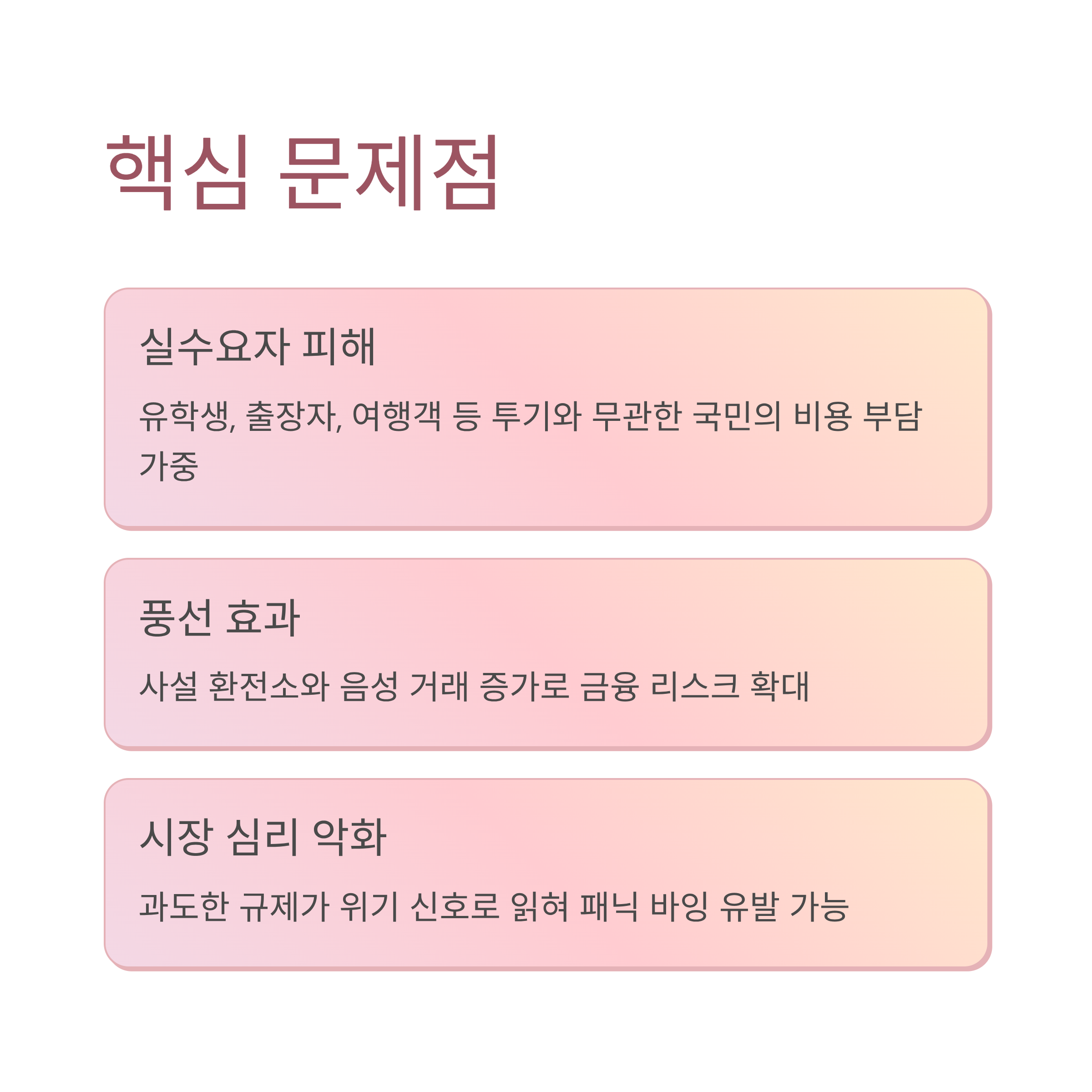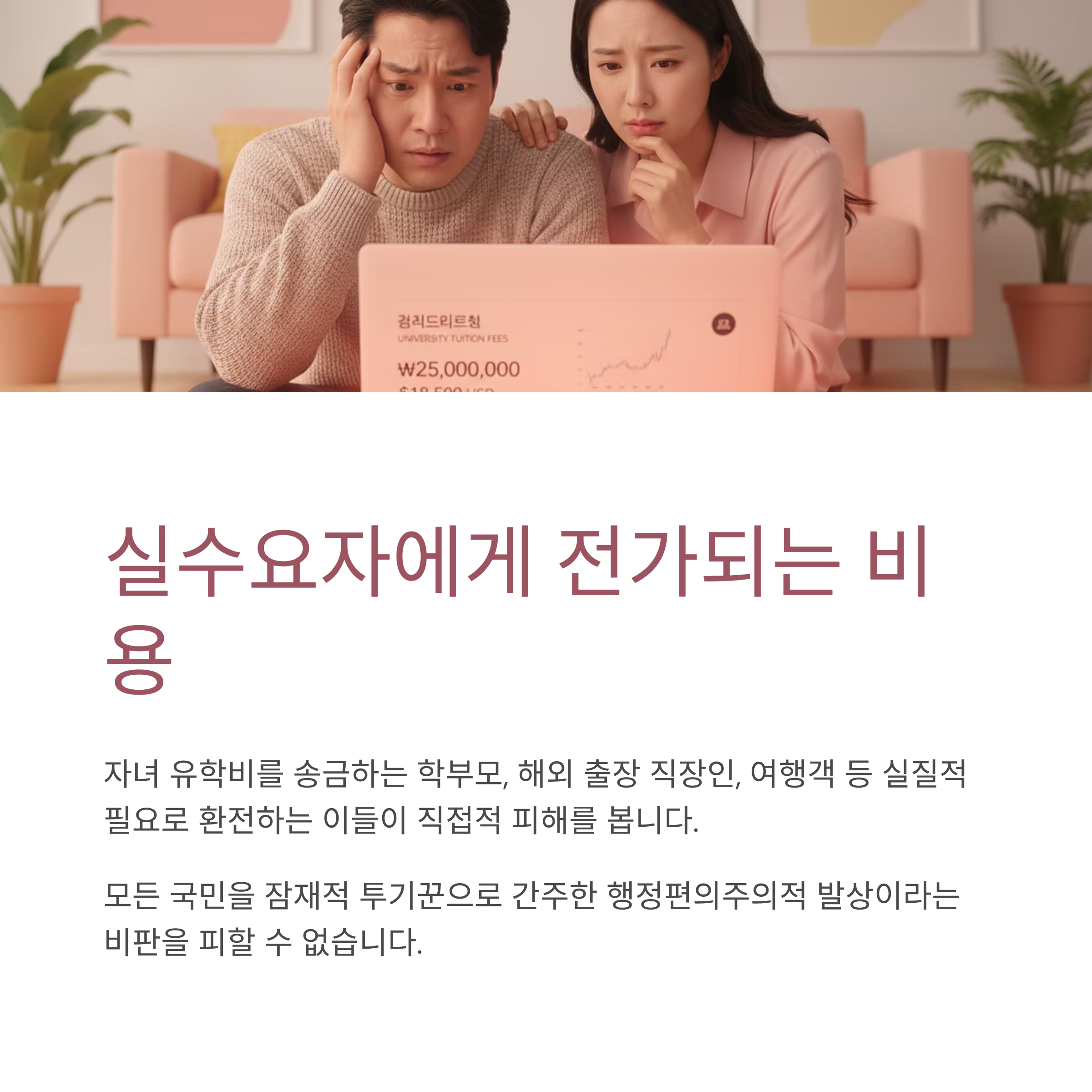 실수요자 피해: 유학생, 해외 출장자, 여행객 등 투기와 무관한 국민의 비용 부담이 가중됩니다.