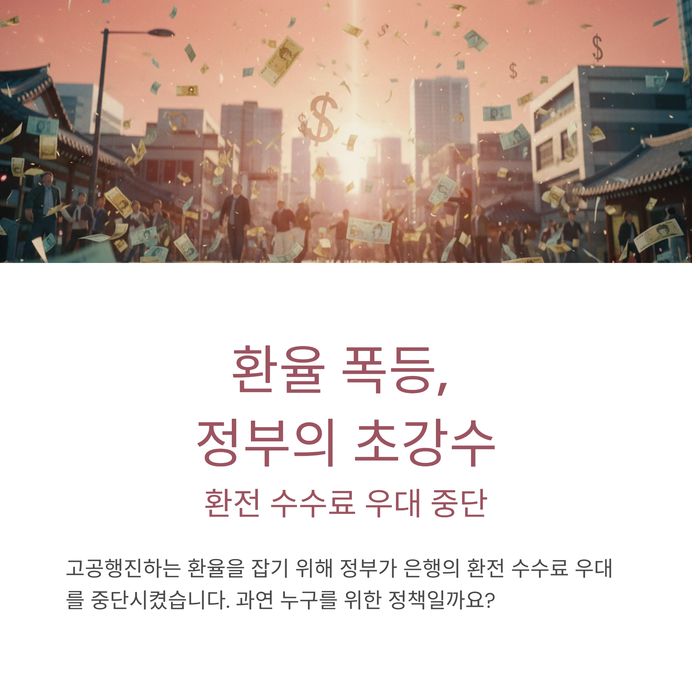 정부가 고환율 안정을 명목으로 은행권의 환전 수수료 우대 혜택을 중단하도록 압박하는 정책을 시행했습니다. 이는 개인의 환차익 목적 달러 매수를 억제하려는 조치지만, 시장의 반응은 싸늘합니다. 이 정책은 아래와 같은 심각한 문제점을 안고 있습니다.