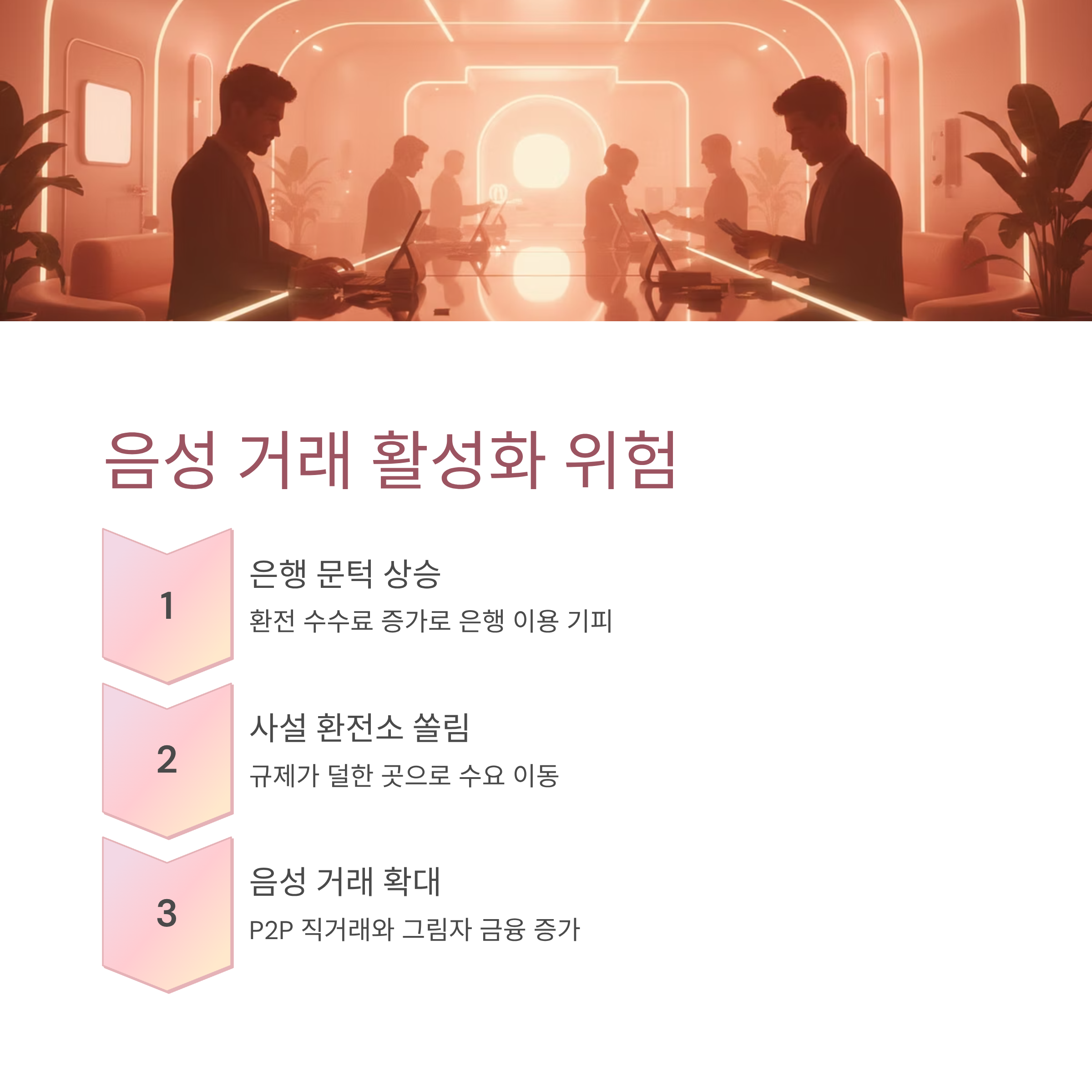 은행의 환전 문턱이 높아지면 수요는 자연스럽게 규제가 덜한 곳으로 쏠리게 됩니다. 이는 '풍선 효과'를 유발하여 사설 환전소나 온라인을 통한 개인 간(P2P) 외화 직거래 같은 음성적 거래를 활성화할 수 있습니다. 정부의 통계에 잡히지 않는 그림자 금융의 규모가 커지는 것은 외환 시장의 투명성을 해치고 관리의 어려움을 가중시키는 결과를 낳습니다.