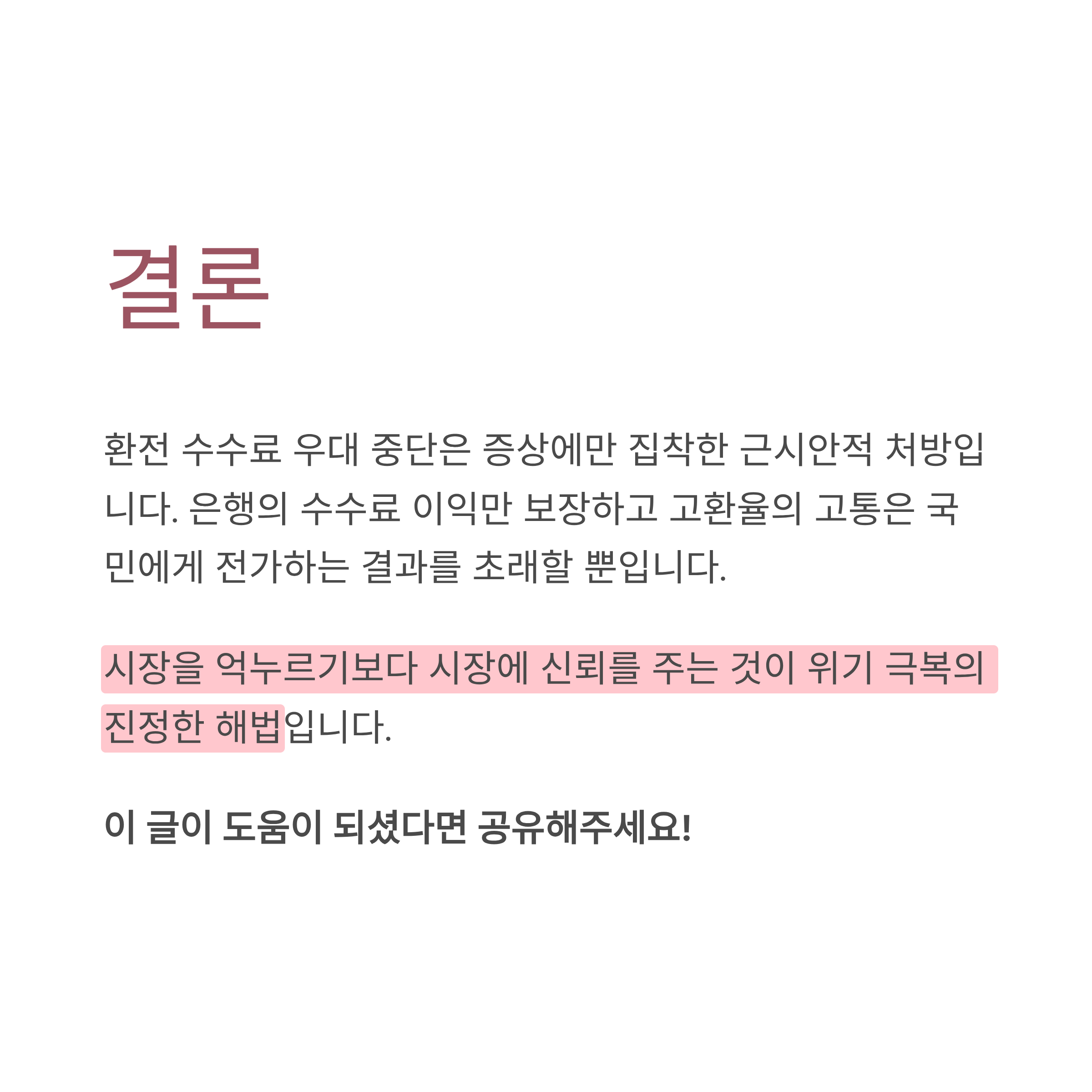 정부의 환전 수수료 우대 중단 압박은 고환율이라는 증상에만 집착한 단기적이고 근시안적인 처방입니다. 이 정책은 개인 거래라는 외환 시장의 극히 일부를 통제하여 환율을 안정시키겠다는 비현실적인 목표를 가지고 있으며, 그 과정에서 실수요자 피해, 음성 시장 확대, 시장 불안 심리 조장 등 수많은 부작용을 낳을 위험이 큽니다. 결국 은행의 수수료 이익만 보장해주고 고환율의 고통은 국민에게 전가하는 결과를 초래할 뿐입니다.