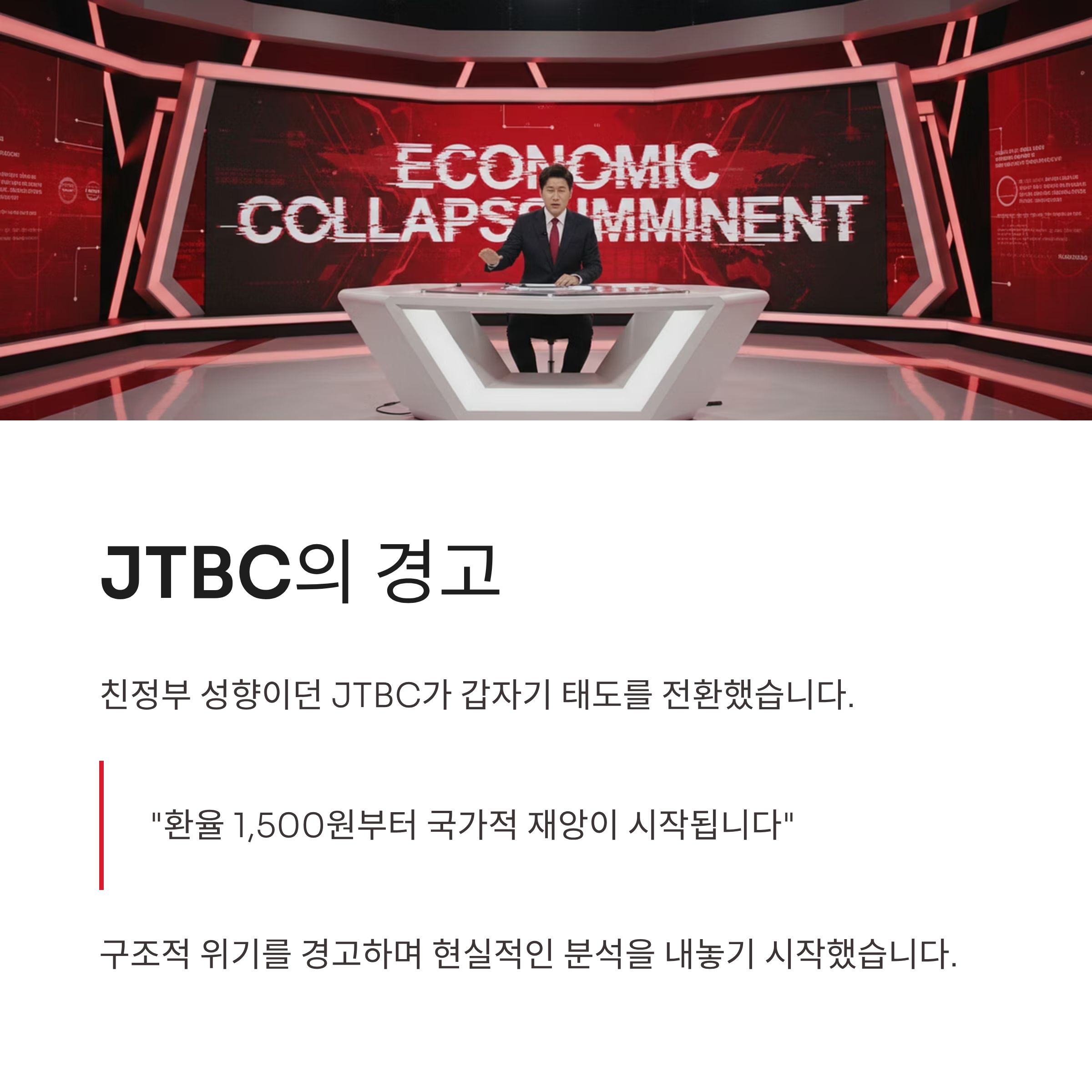 반면, 친정부 성향으로 평가받던 JTBC는 갑자기 "환율 1,500원부터 국가적 재앙"이라며 구조적 위기를 경고하는 태세 전환을 보였습니다.