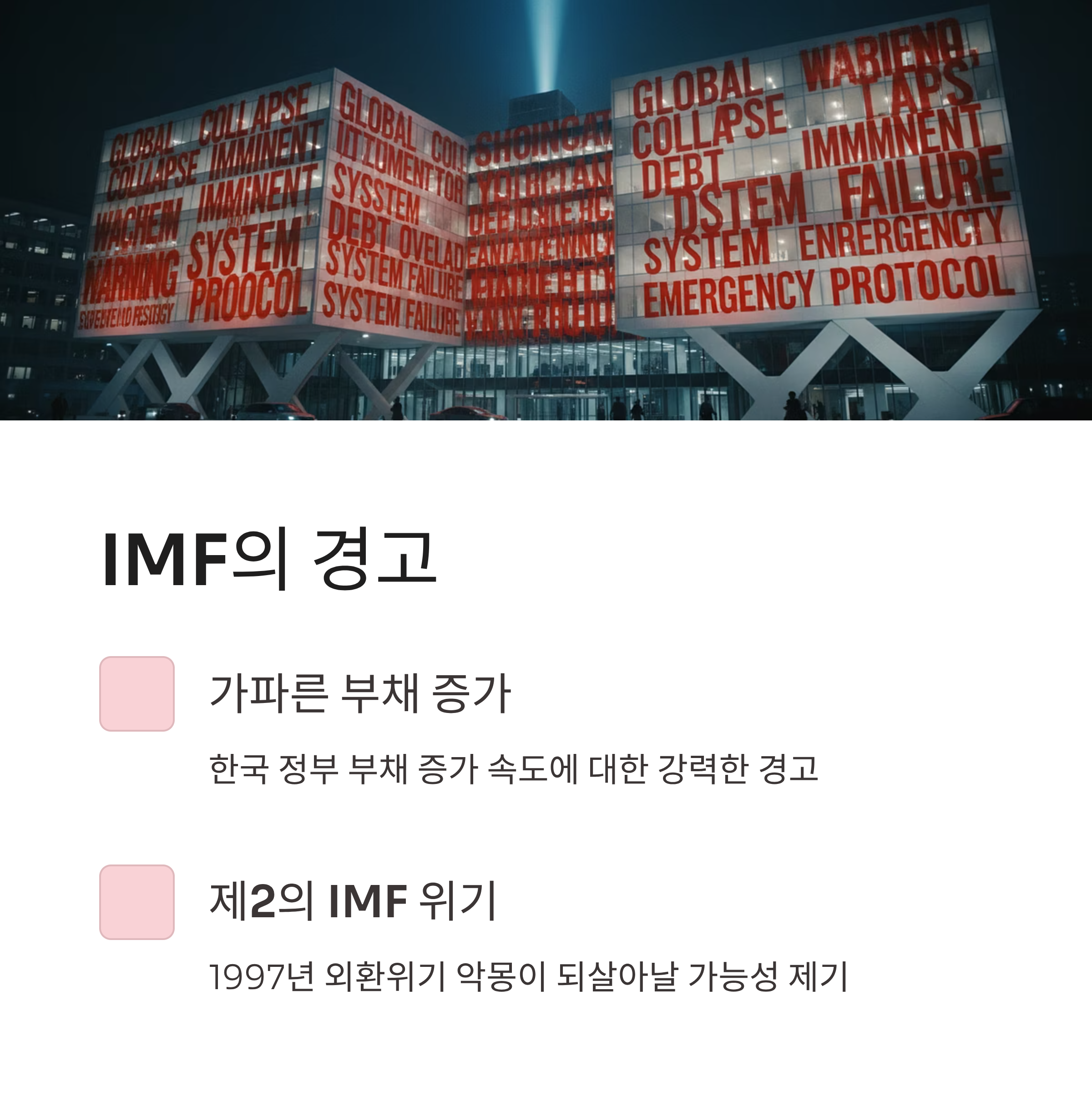 IMF 역시 한국의 정부 부채 증가 속도를 강력히 경고하며 제2의 IMF 위기 가능성까지 제기되는 심각한 상황입니다.