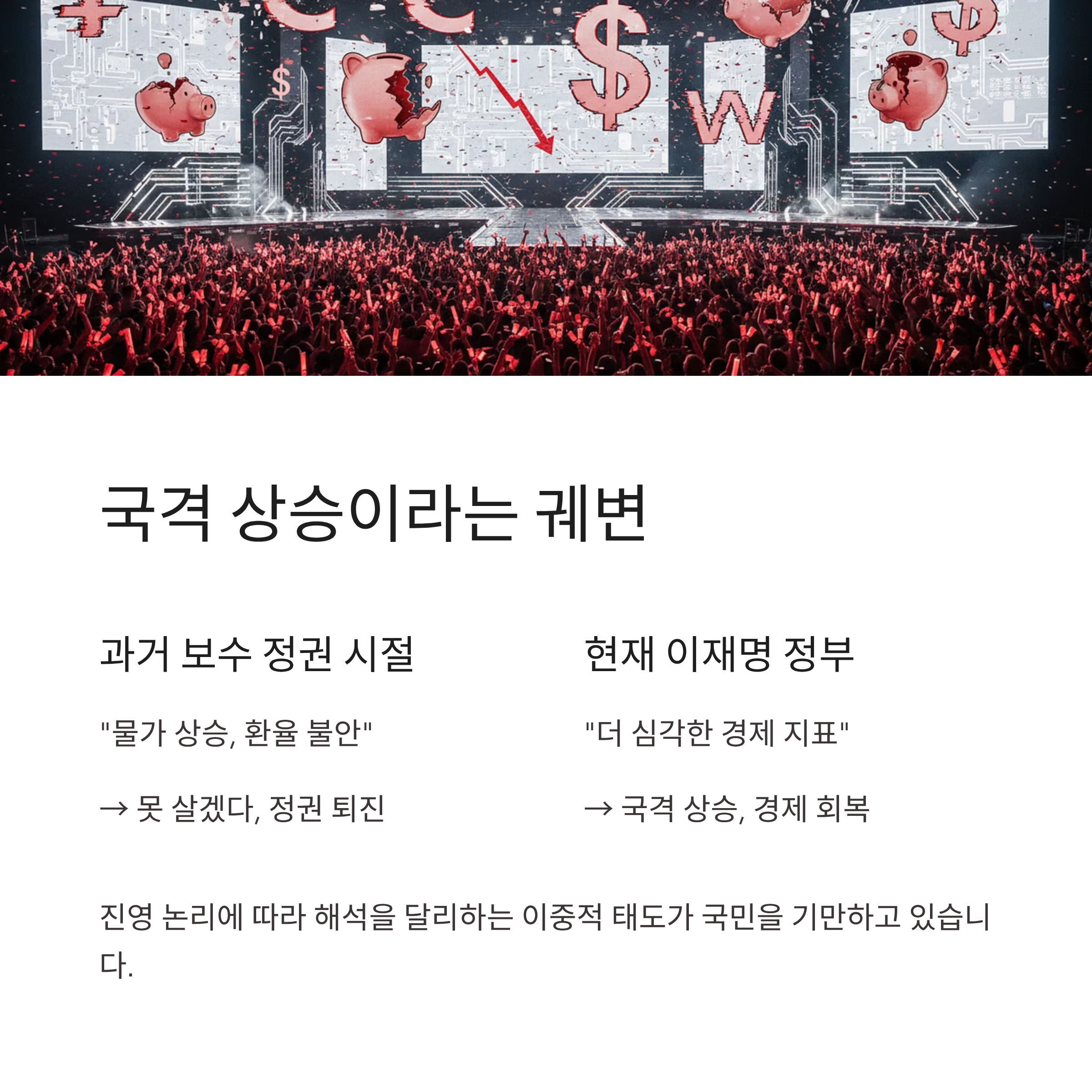 | A2. 전혀 타당하지 않은 궤변입니다. 일부 지지층은 K-콘텐츠의 인기가 높아져 환율이 오른다는 논리를 펴지만, 환율 급등은 화폐 가치 하락을 의미하며 경제 불안정의 신호입니다. 과거 보수 정권 때는 물가 상승을 비판했던 이들이 현재는 이를 '경제 회복'으로 포장하는 이중적인 태도를 보이고 있습니다. |