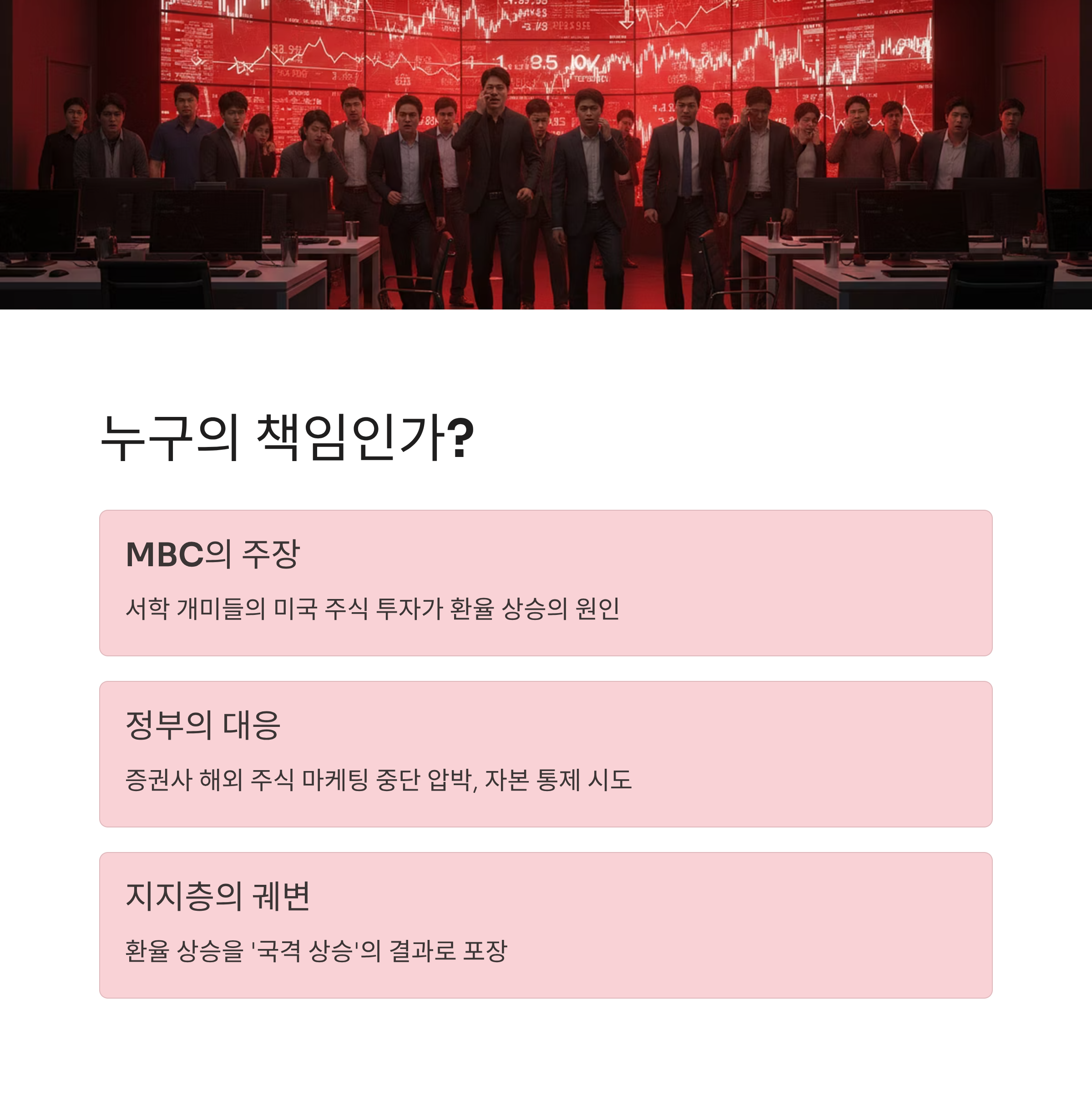 | A1. 정부와 MBC는 환율 상승의 주요 원인을 미국 주식에 투자하는 개인 투자자들, 즉 '서학 개미'들이 달러를 사들이기 때문이라고 주장합니다. 이에 따라 금융감독원은 증권사의 해외 주식 마케팅을 중단시키는 등 인위적인 통제에 나서고 있지만, 이는 근본적인 해결책이 아닌 책임 전가에 가깝습니다. |