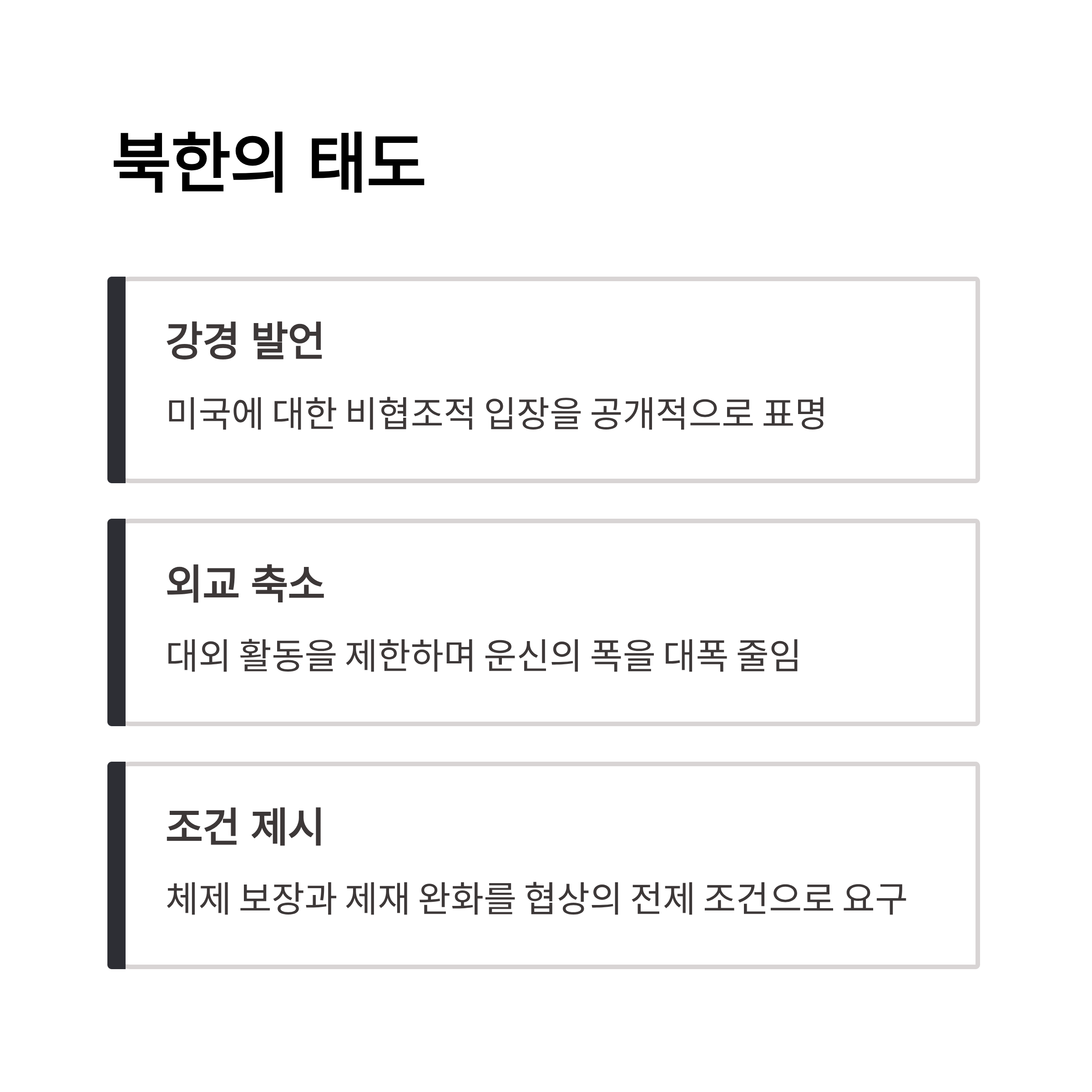 | A. 이는 미국에 대한 체제 보장이나 기존 제재 완화를 요구하는 신호로 해석될 수 있으며, 동시에 협상 조건이 자신들에게 불리하다는 판단일 수 있습니다. 국제 정치에서 협상 전략으로 흔히 사용되는 방식입니다. |