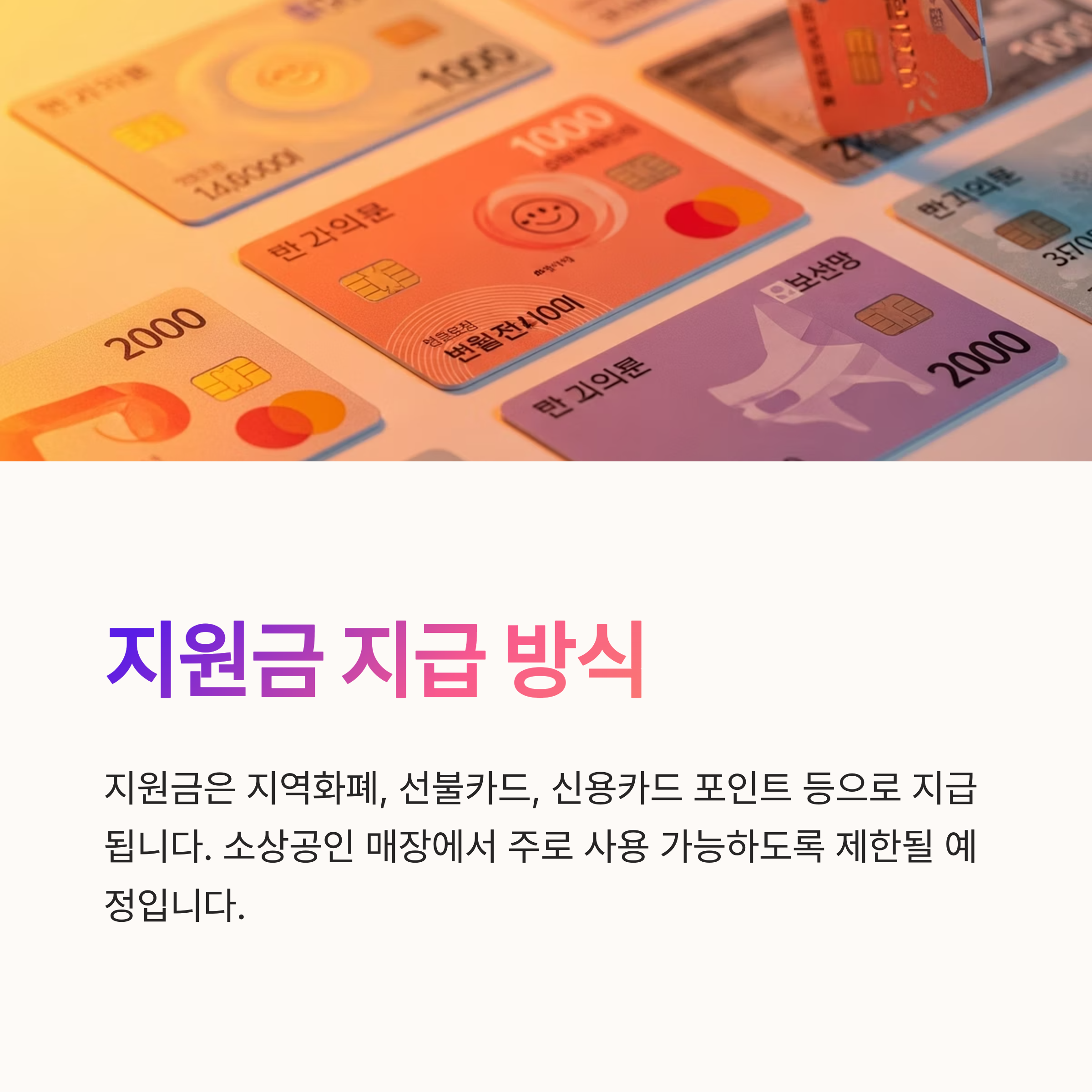 4. 지원금 지급은 지역화폐, 선불카드, 신용카드 포인트 등으로 이루어지며, 소상공인 매장에서 주로 사용 가능하도록 제한됩니다.