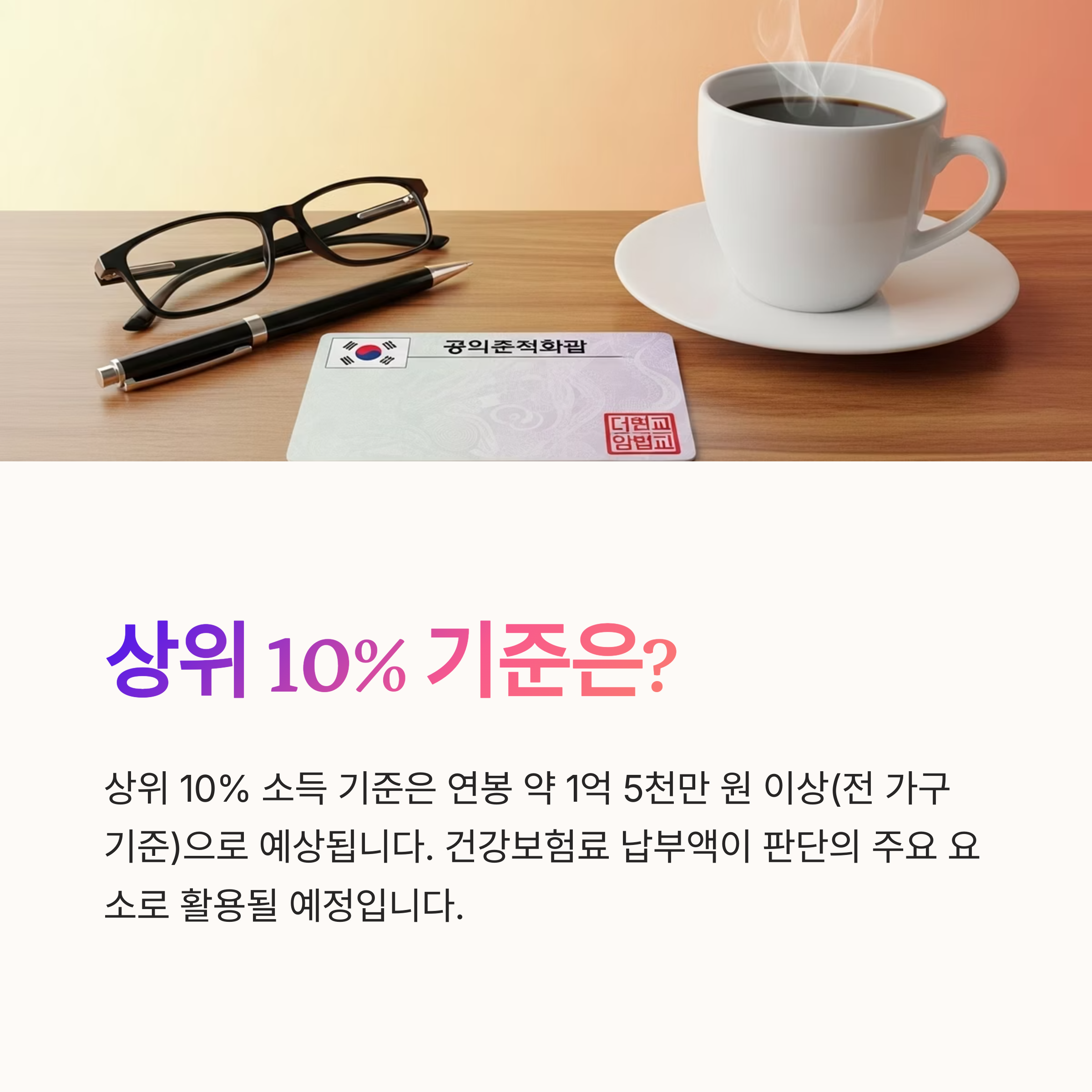 2. 상위 10% 소득 기준은 연봉 약 1억 5천만 원 이상(전 가구 기준)으로 예상되며, 건강보험료 납부액이 주요 판단 요소입니다.