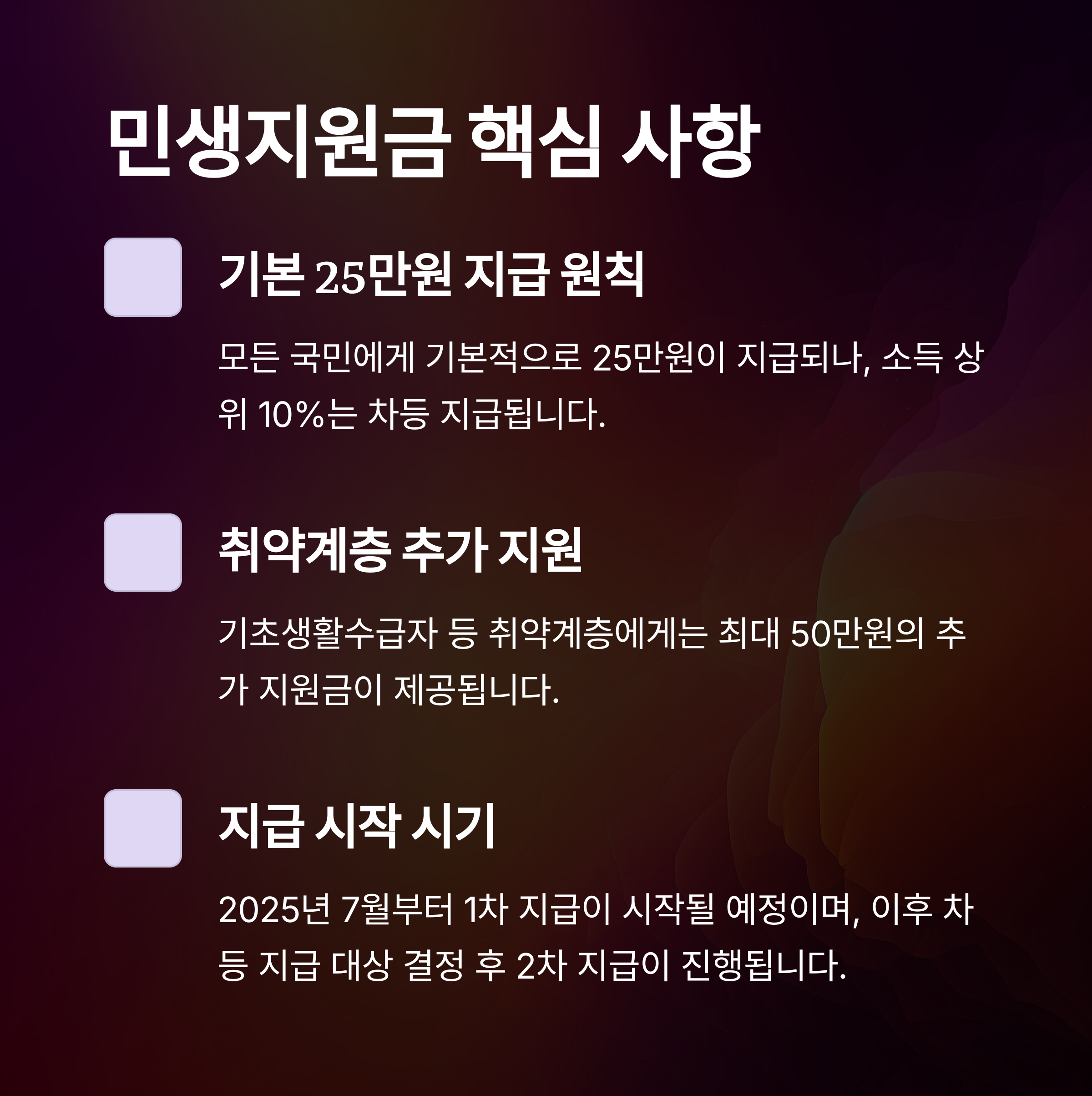 3. 취약계층(기초생활수급자 등)에는 최대 50만원의 추가 지원금을 배분해 생활 안정을 도모합니다.
