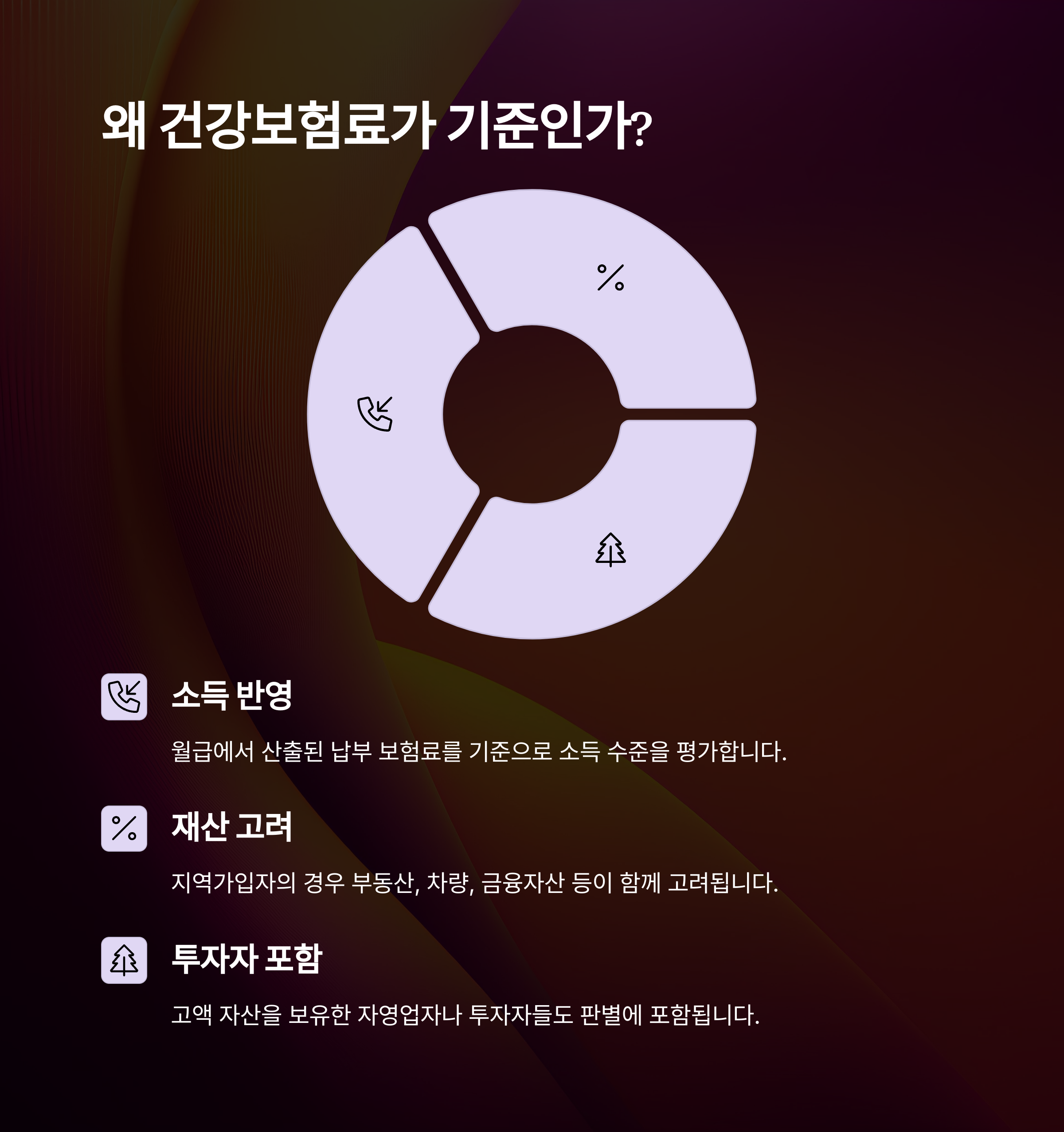 | A. 소득 합산 기준으로 연간 1억 5천만 원 이상으로 예상되며, 건강보험료 납부액을 기반으로 판별합니다. 이는 일반 소득뿐 아니라 재산 및 금융자산도 함께 고려됩니다. |