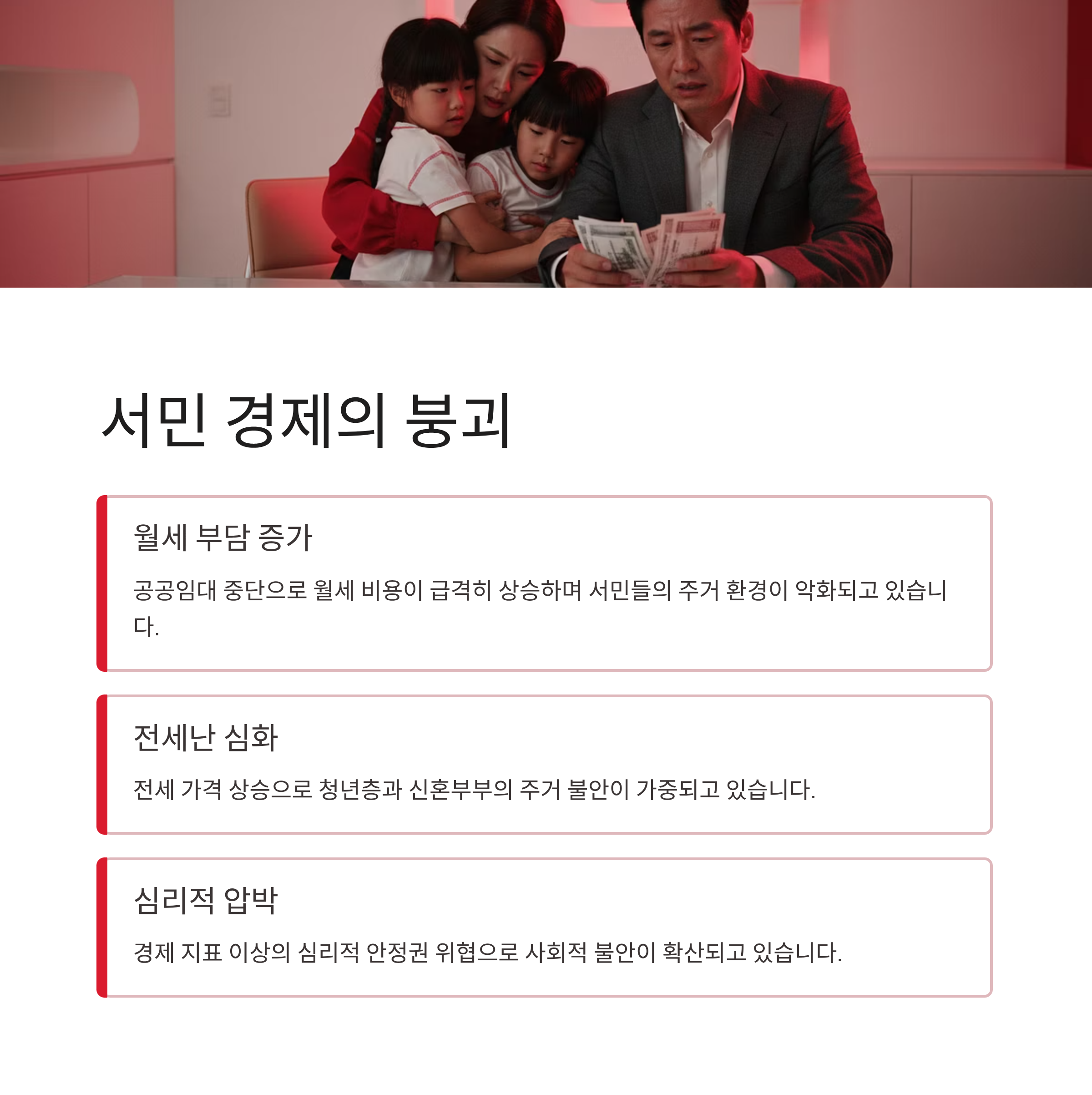 공공임대 공급은 사실상 중단되었고, SH의 행복주택 경쟁률은 평균 70대 1을 기록하며 주거 불안이 가속화되었습니다.