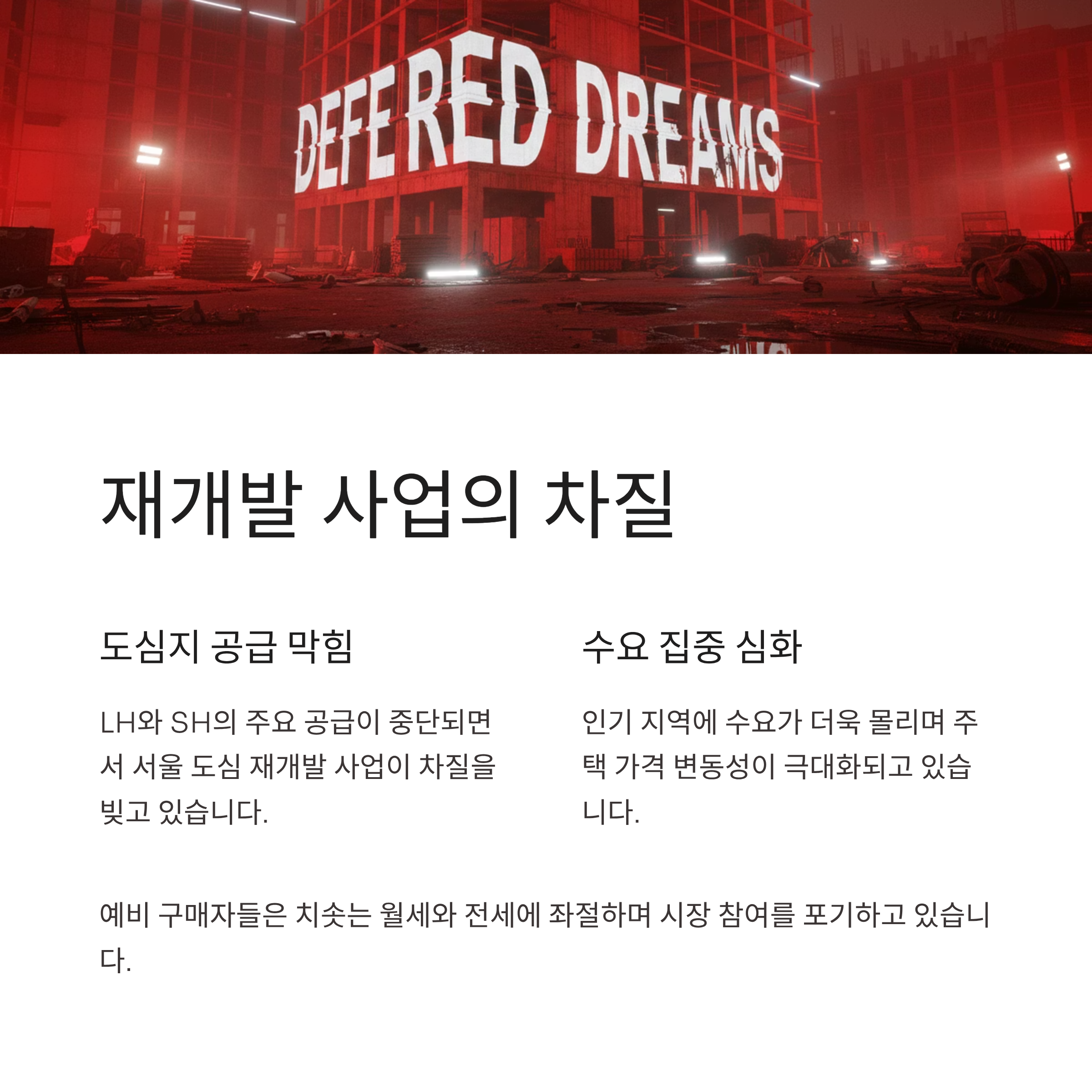 특히 LH와 SH의 주요 공급이 막히면서 도심지 재개발 사업도 차질을 빚고 있습니다. 서울 송파구와 성동구와 같은 인기 지역은 수요가 더욱 집중되며 주택 가격 변동성이 심화되었습니다. 예비 주택 구매자와 임대 희망자들은 치솟는 월세와 전세에 속속 좌절하며 시장 참여 자체를 포기하고 있는 상황입니다.