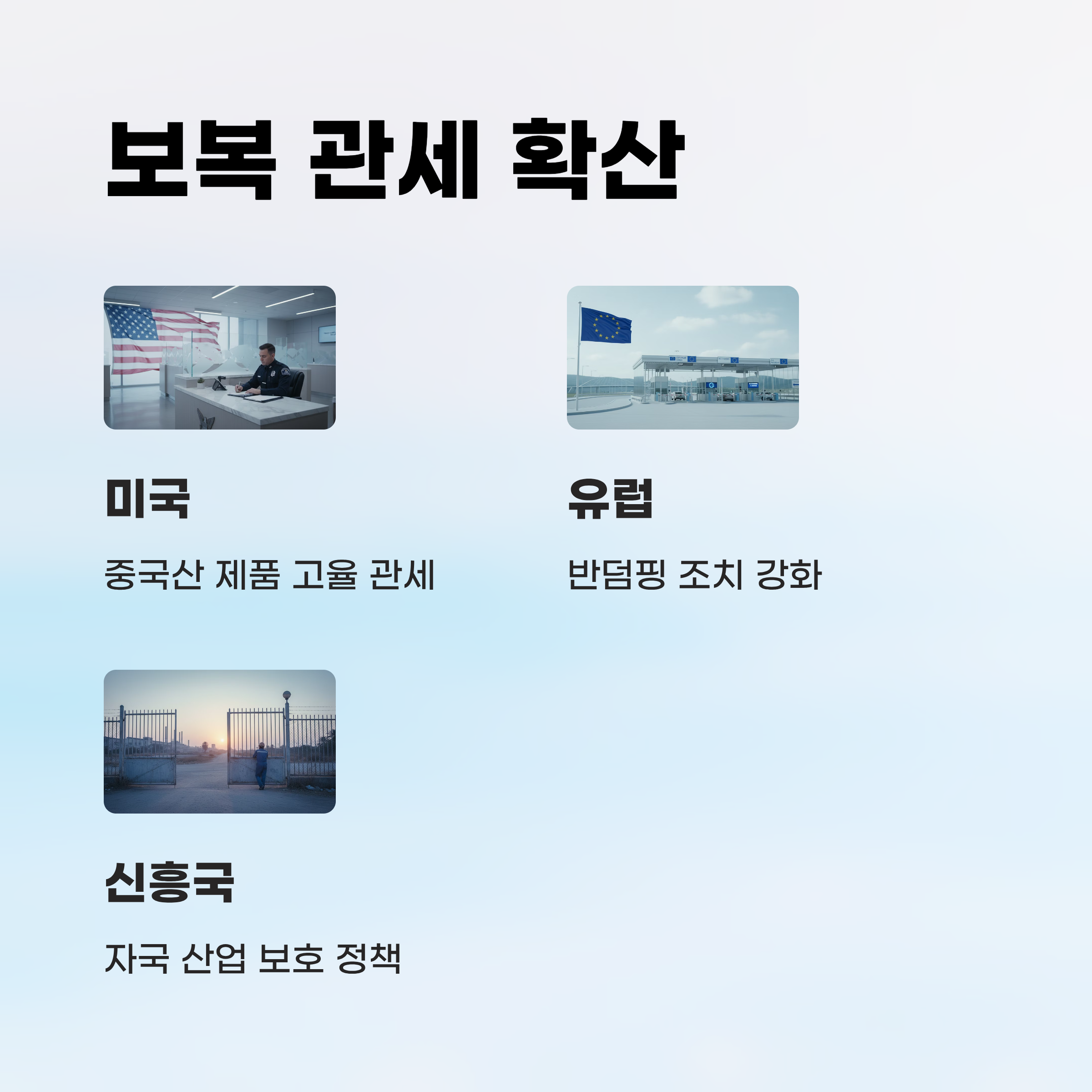 중국의 '밀어내기 식' 수출은 전 세계 교역 질서를 뿌리째 흔들고 있습니다. 중국산 초저가 제품이 쏟아지면서 이를 수입하는 국가의 산업 생태계는 붕괴 위기에 처했습니다. 과거 철강, 태양광에 이어 최근에는 전기차, 배터리, 화학 제품까지 그 범위가 확대되고 있습니다. 이에 대응해 선진국뿐만 아니라 멕시코, 브라질 등 신흥국들도 자국 산업 보호를 위해 관세 장벽을 높이고 있습니다. 이는 마치 과거 코로나19가 전 세계에 피해를 주었듯, 중국발 '경제적 디플레이션'이 전 세계로 감염되고 있는 형국입니다.