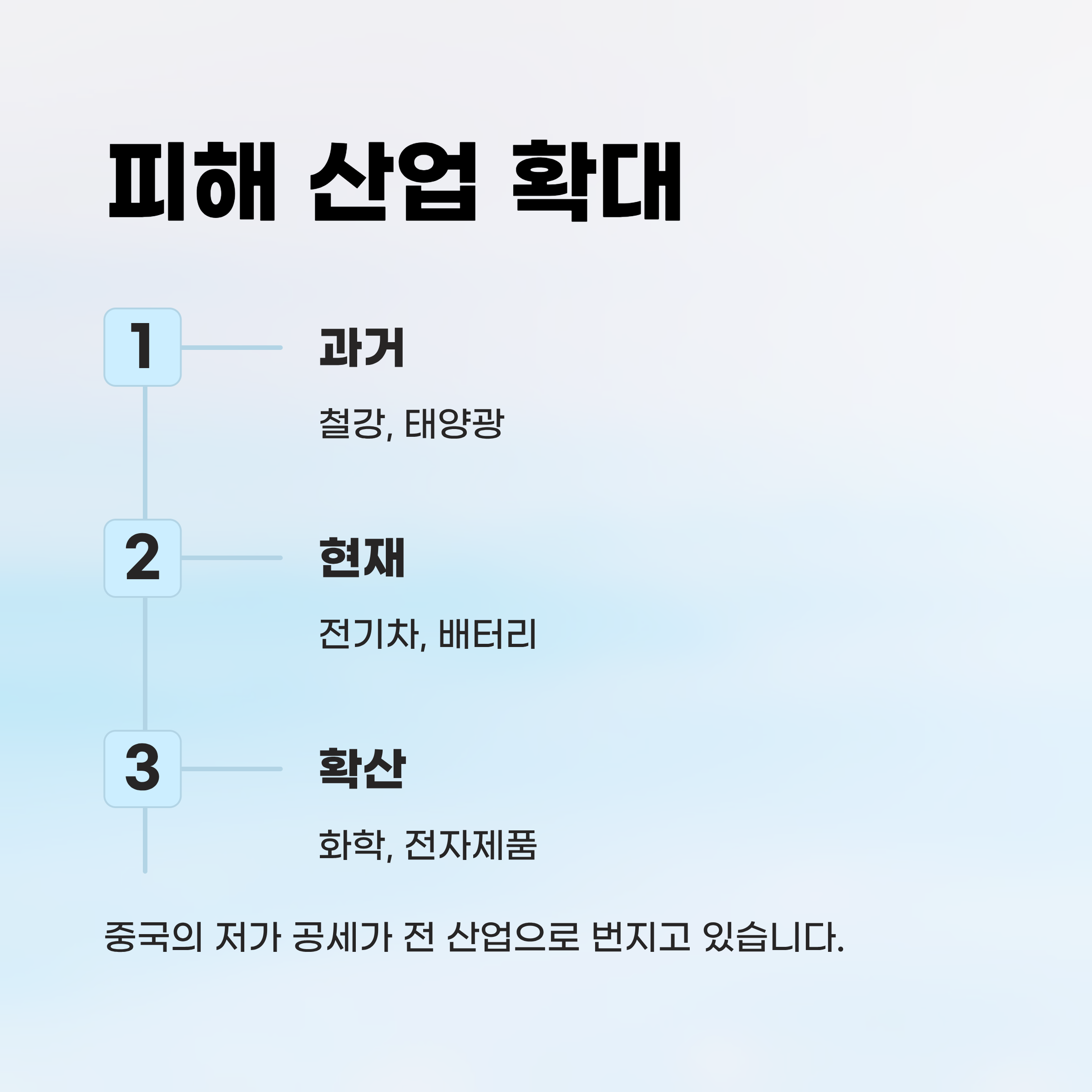 | A. 중국의 저가 물량 공세는 수입국의 동종 산업 기업들이 가격 경쟁에서 도태되게 만들어 줄도산을 유발합니다. 이는 해당 국가의 제조업 기반 붕괴와 대규모 실업 사태로 이어지며, 결국 국가 경제 성장률을 갉아먹는 결과를 초래합니다. 또한, 이에 대응하기 위한 보복 관세 조치들이 난무하면서 글로벌 교역 자체가 위축되는 악순환을 낳습니다. |
