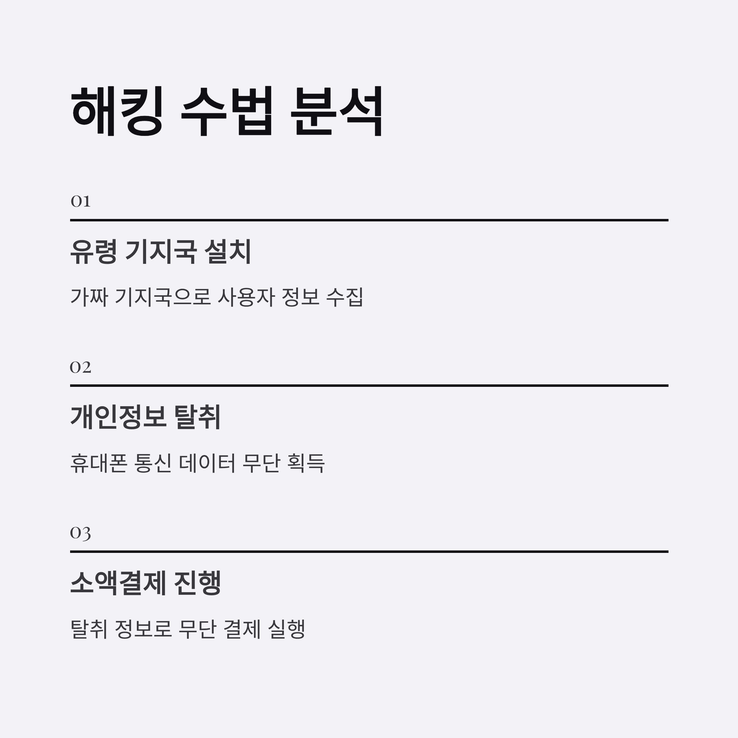 3. 유령 기지국을 통한 정보 탈취와 소액 결제가 주요 수법.