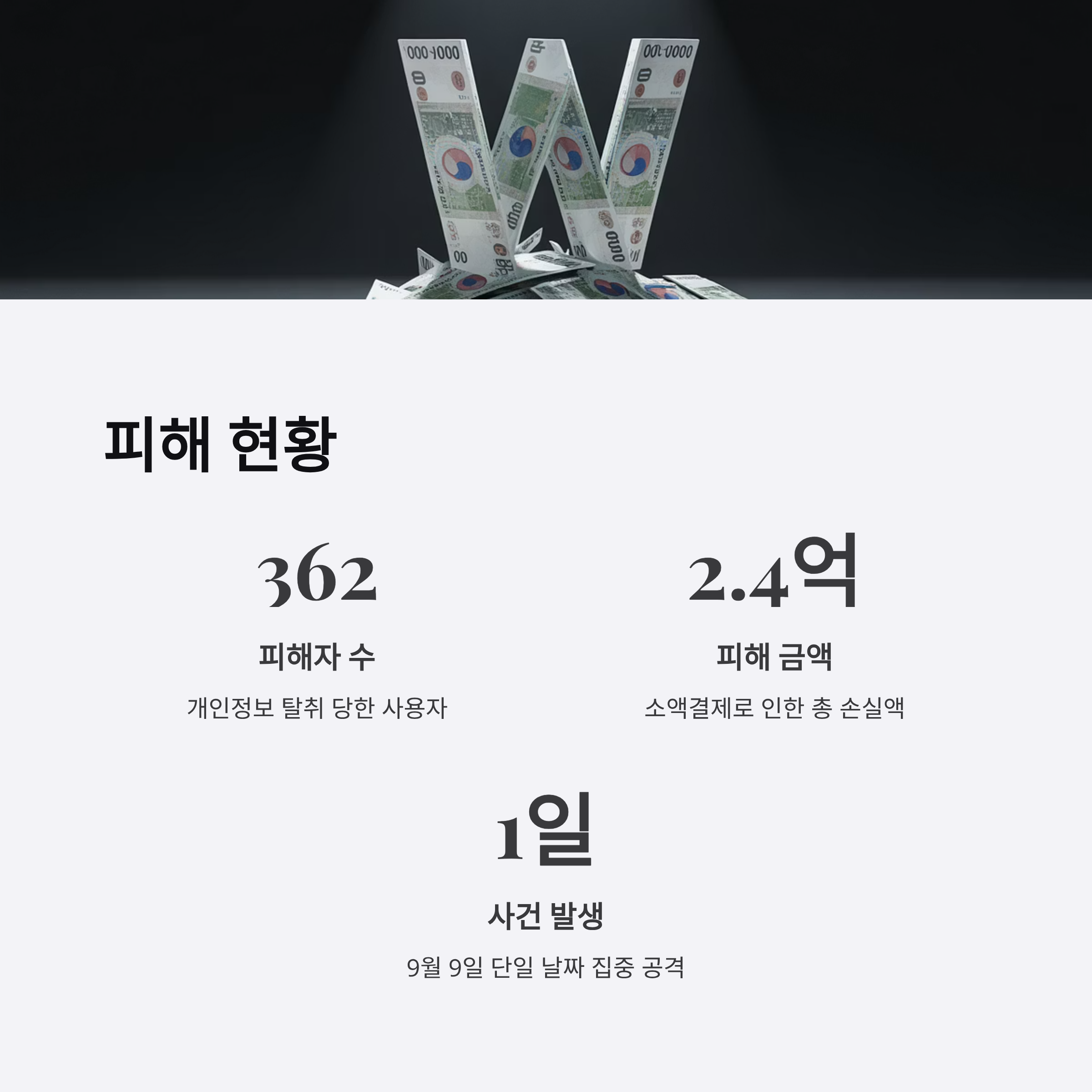 1. 지난 9월 9일 KT를 대상으로 개인 정보를 활용한 소액 결제 해킹 사건 발생.