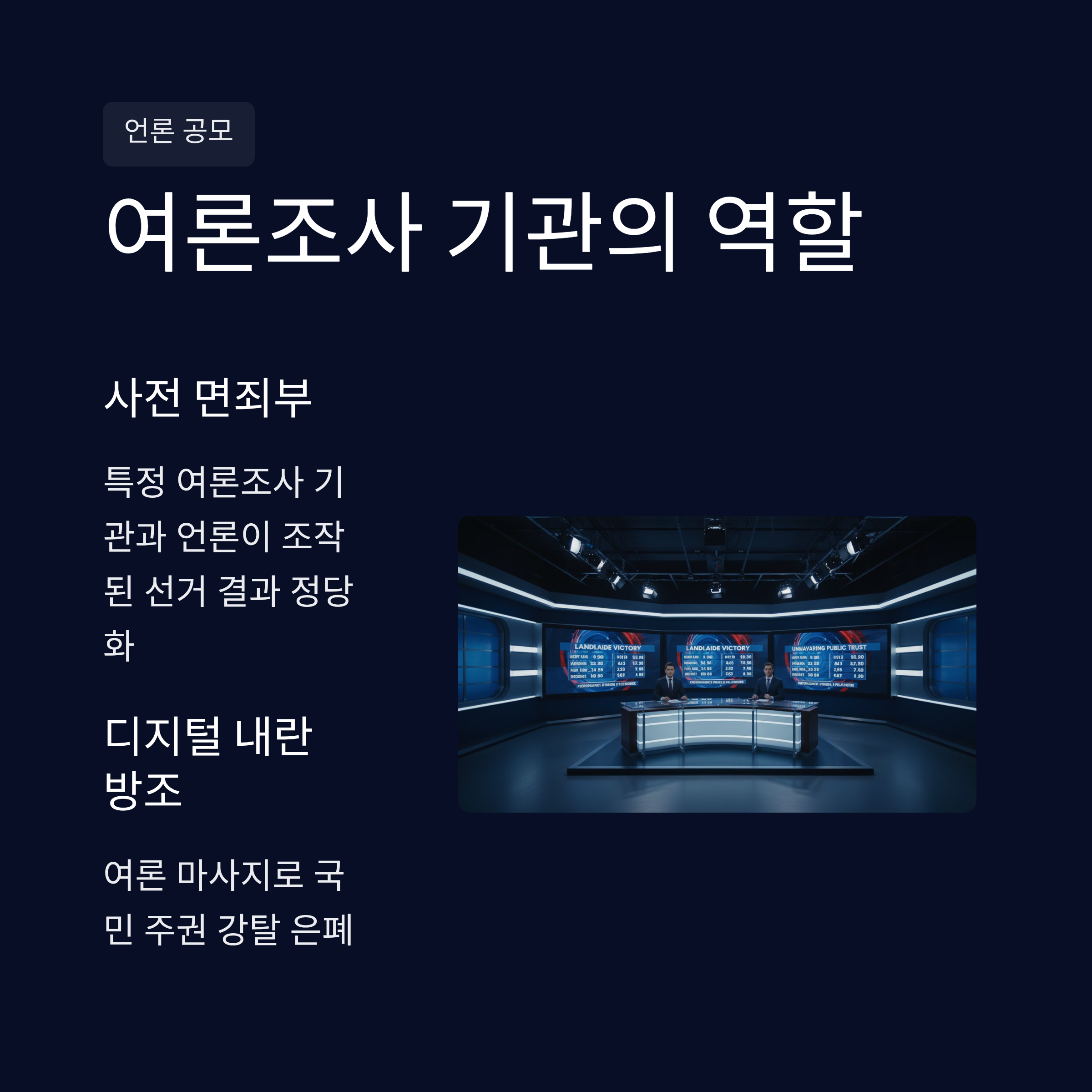또한, 특정 여론조사 기관과 언론은 조작된 선거 결과를 정당화하며 디지털 내란의 '사전 면죄부' 역할을 수행했다는 비판을 받고 있습니다.