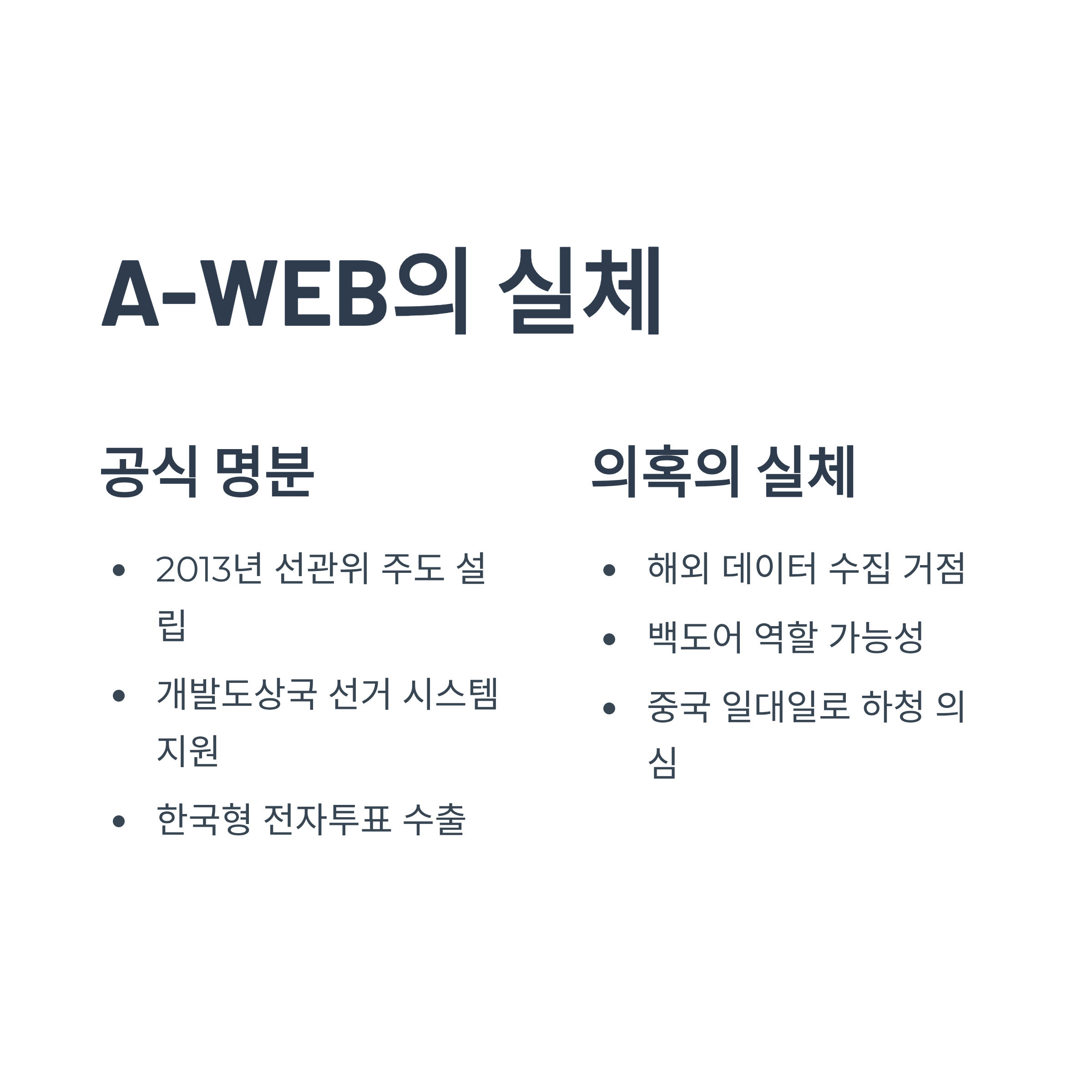 | A. A-WEB은 2013년 한국 중앙선관위 주도로 설립된 국제 기구로, 개발도상국에 한국형 선거 시스템을 수출하고 지원하는 역할을 합니다. 하지만 최근 미국 측 보고서 등을 통해 이 조직이 해외 선거 데이터를 수원으로 전송받거나 조작에 관여할 수 있는 시스템을 갖췄다는 의혹과 함께, 중국 일대일로 사업의 하청 기관이라는 의심까지 받고 있습니다. |