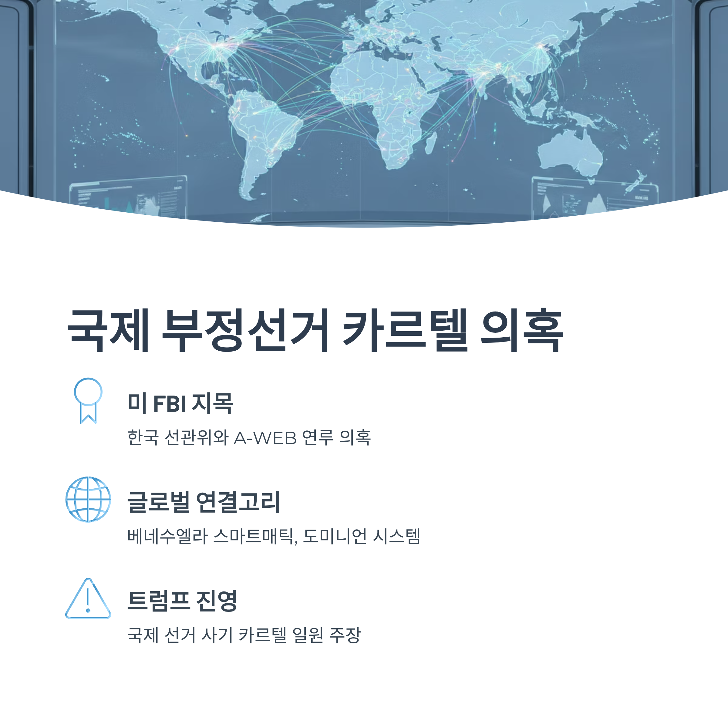 국제 카르텔 의혹: 미 FBI 및 트럼프 진영에서 지목하는 '국제 부정선거 카르텔'의 한 축으로 한국 선관위와 A-WEB이 거론되고 있습니다.
