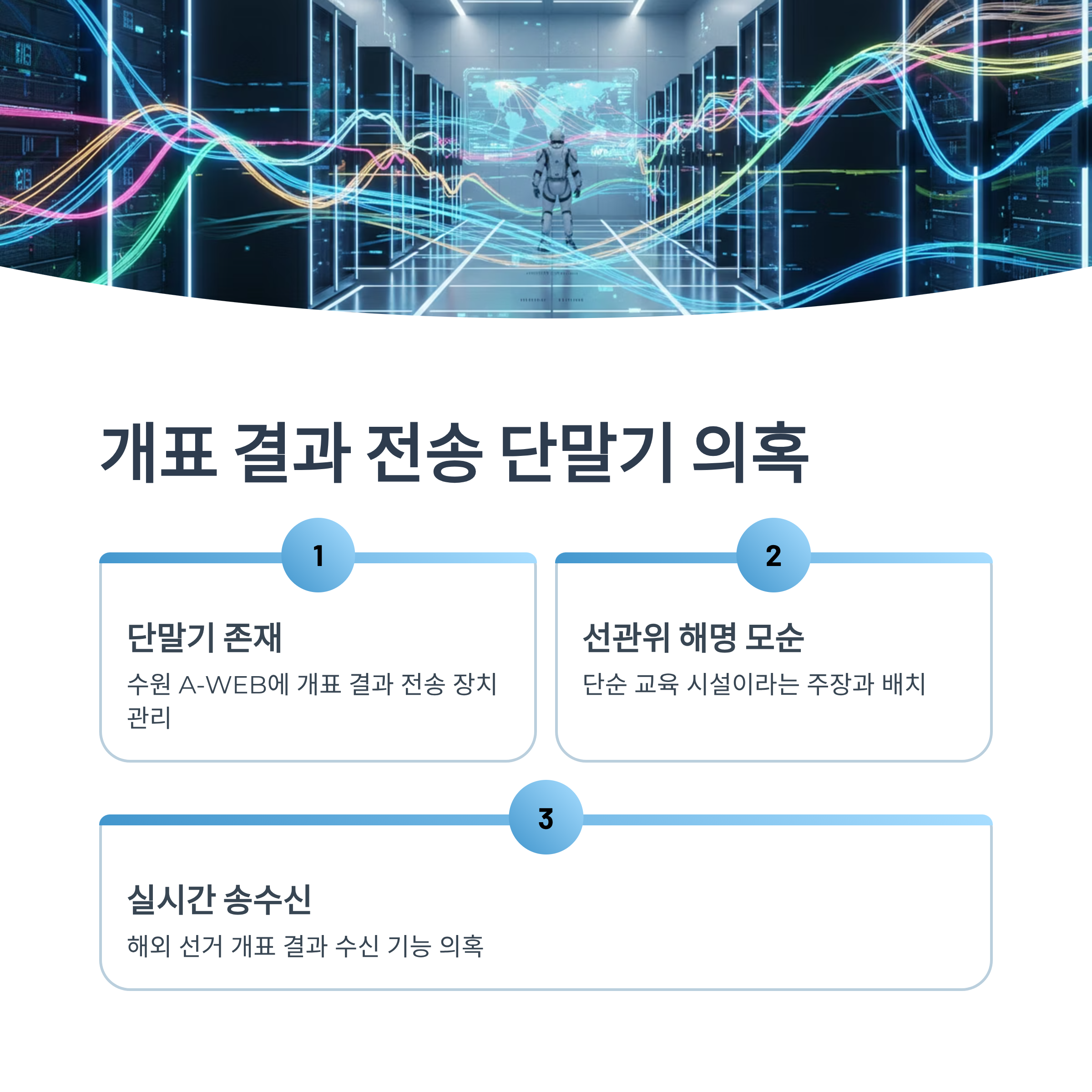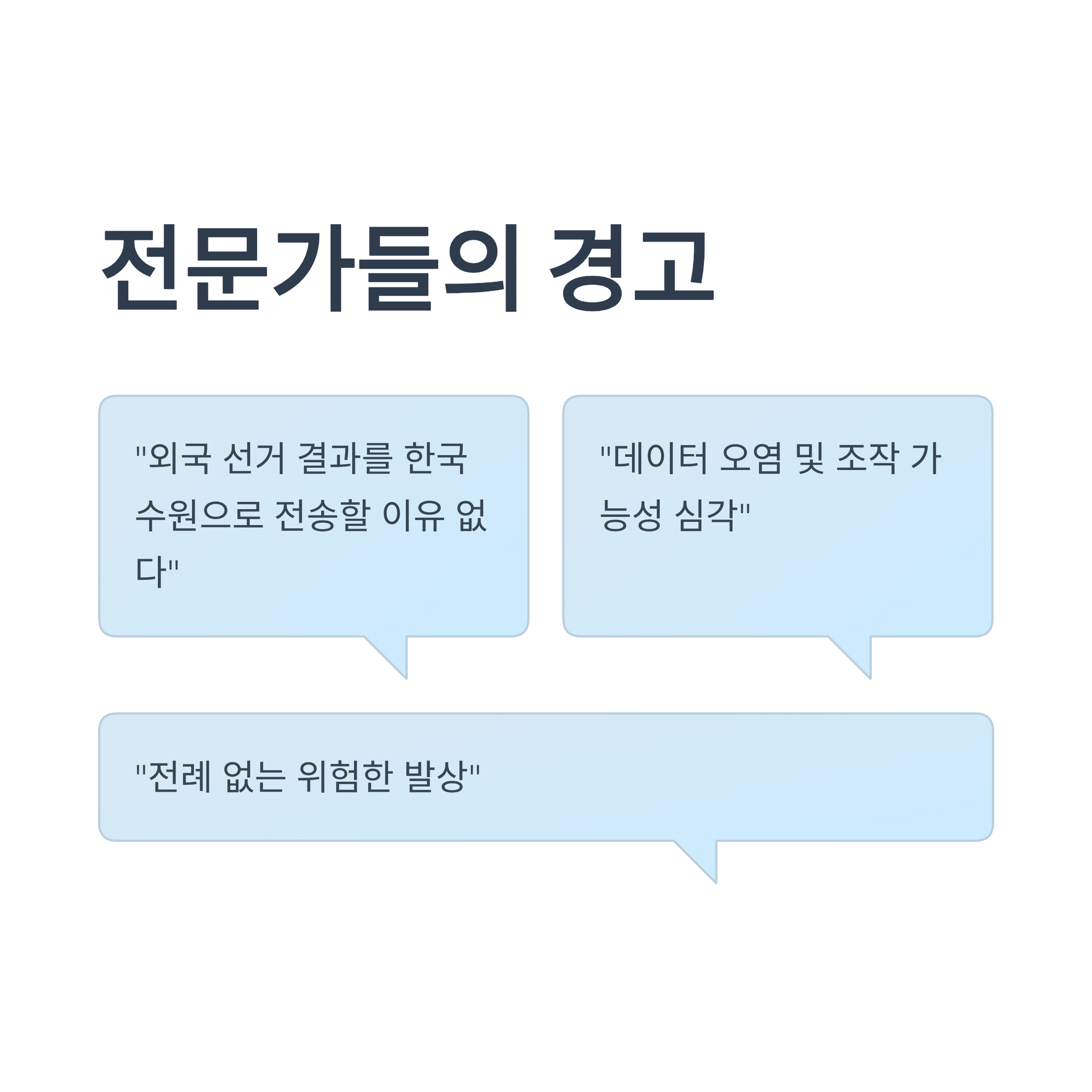 전문가 반응: 다수의 보안 및 선거 전문가들은 "외국 선거 결과를 굳이 한국 수원으로 전송할 이유가 없다"며 데이터 오염 및 조작 가능성을 경고했습니다.