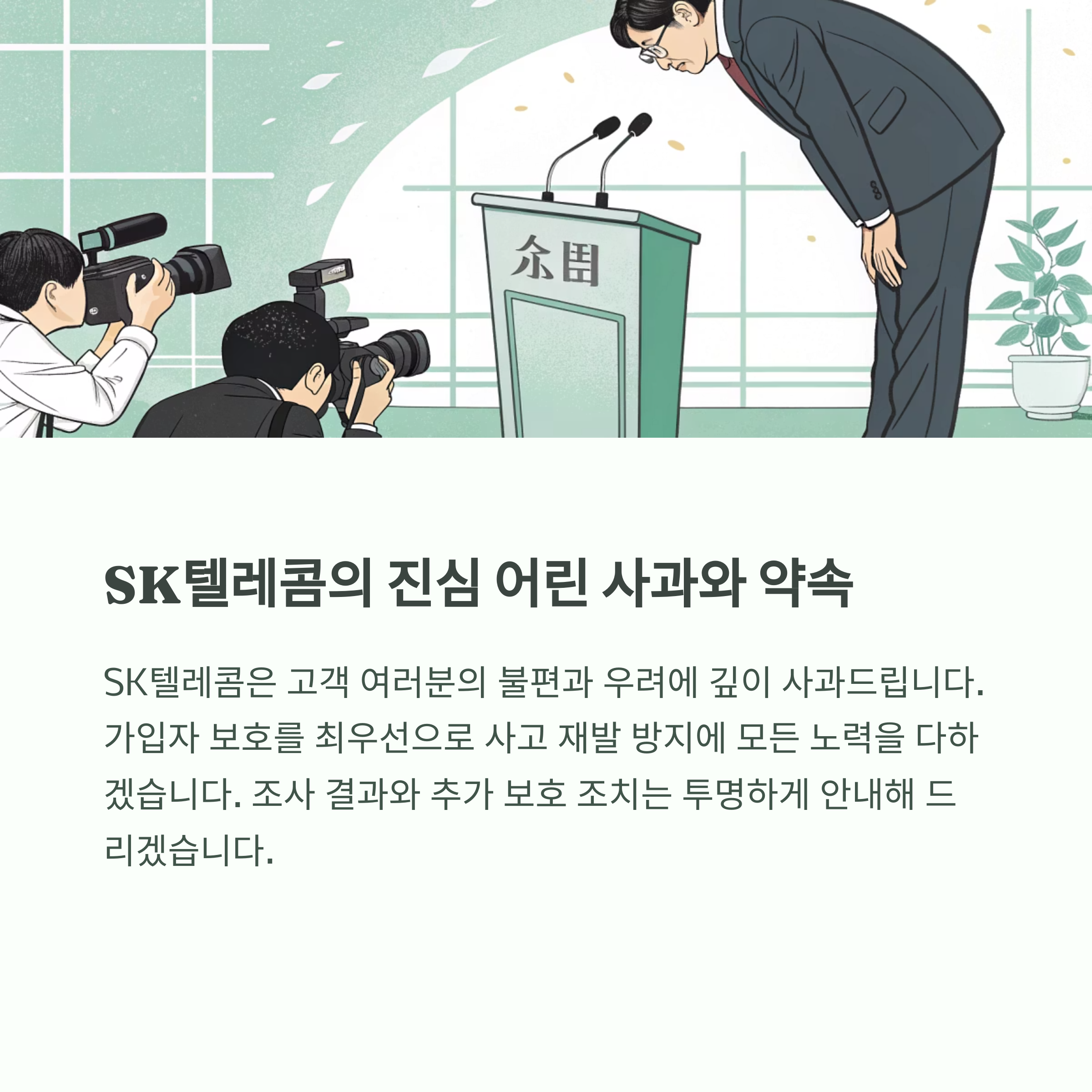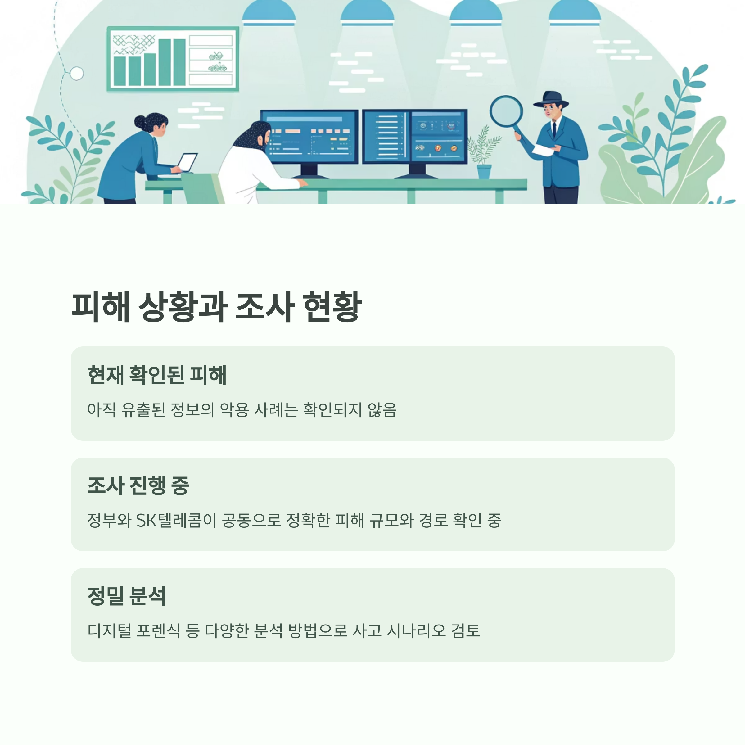 - 유출 정보는 유심 관련 데이터이며, 주민등록번호 등 민감 정보는 유출되지 않았다고 확인됨.