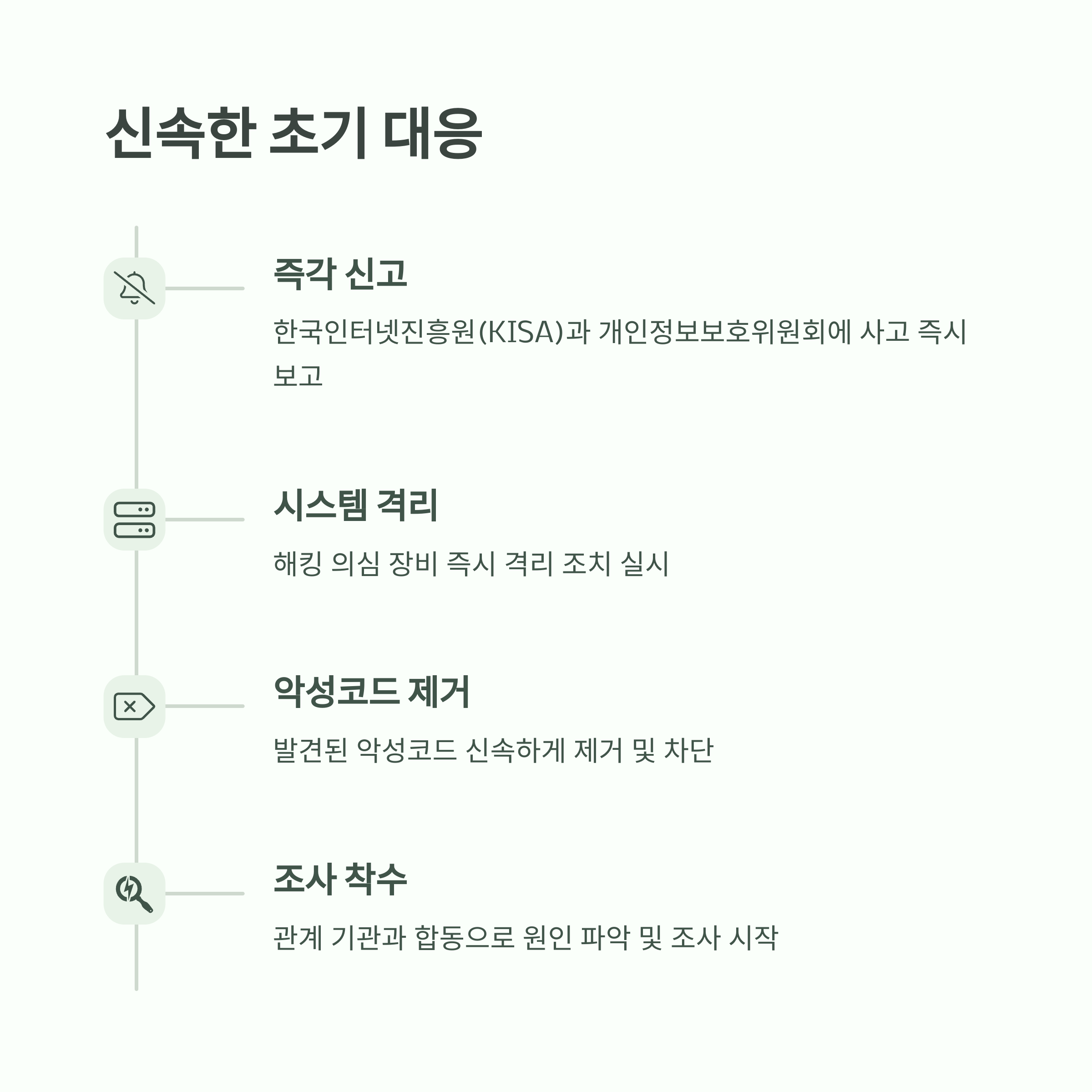 - 사고 즉시 한국인터넷진흥원과 개인정보보호위원회에 보고되었으며, 시스템 격리와 악성 코드 제거가 이뤄짐.