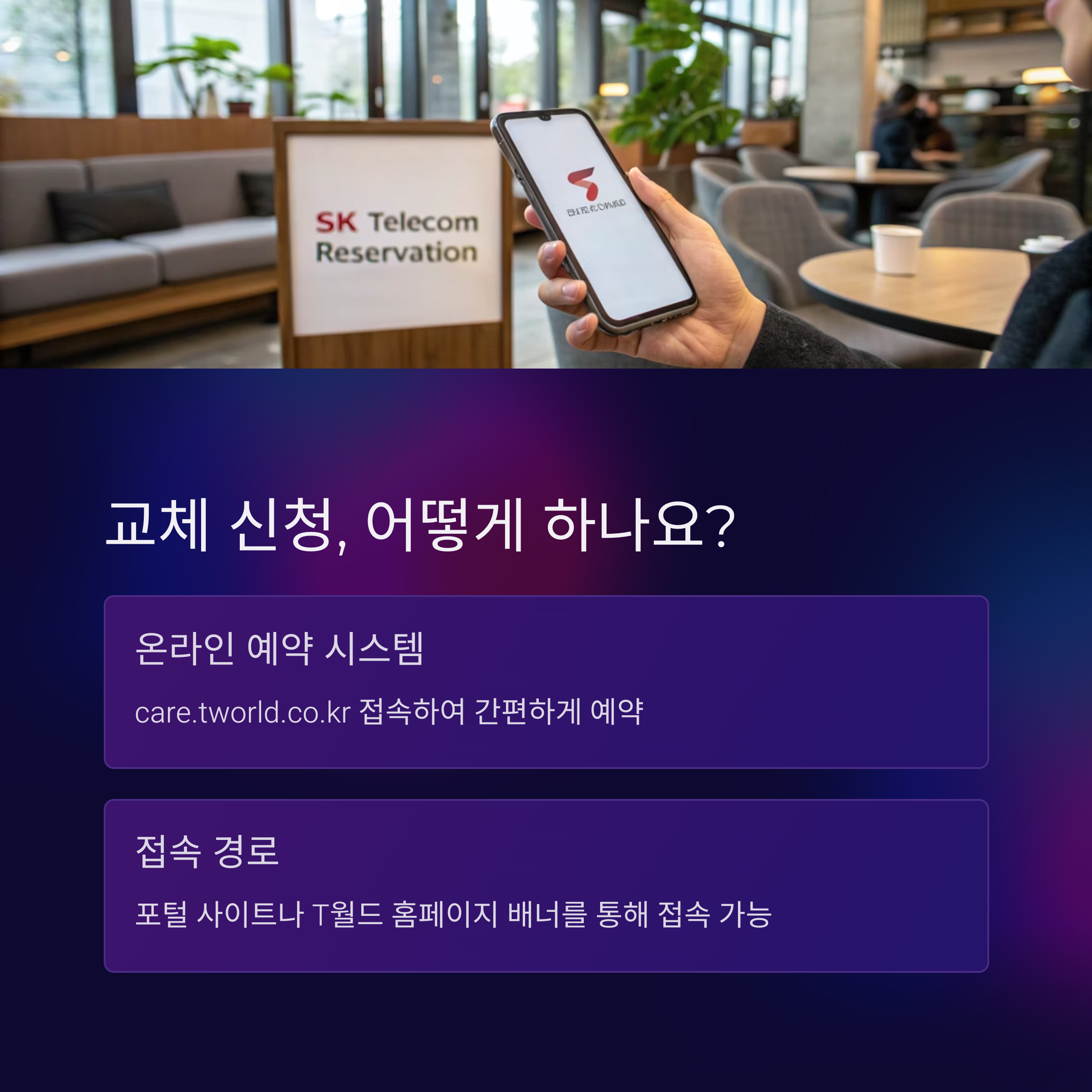 | A. 유심 교체는 전국 T월드 매장과 공항 로밍센터에서 가능하며, T월드 앱에서 가까운 지점을 검색할 수 있습니다. |