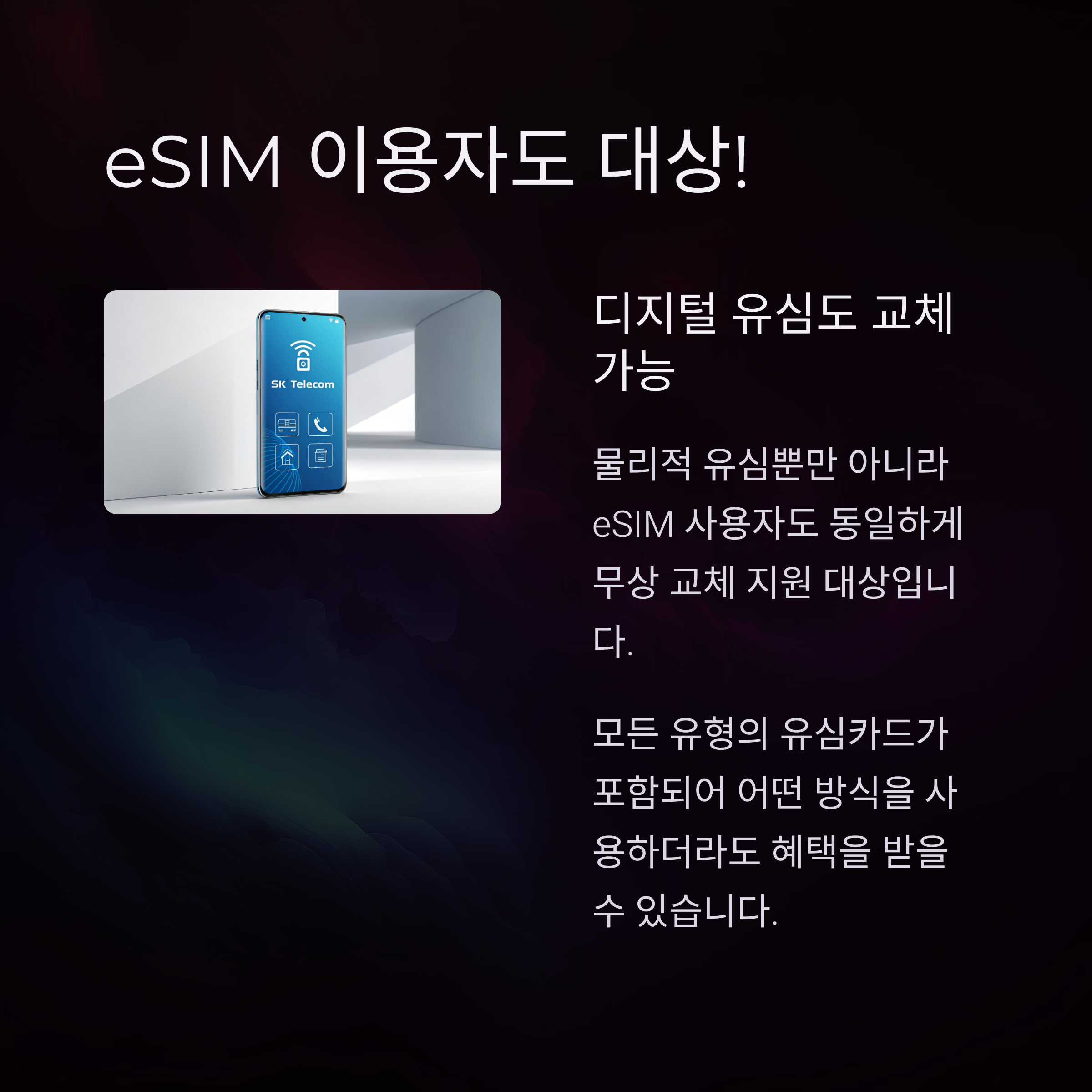 | A. 네, 이번 유심 교체 서비스는 기본 유심뿐만 아니라 eSIM 사용자도 포함됩니다. eSIM 서비스와 관련된 추가 지원은 SK텔레콤에 문의하시길 권장합니다. |