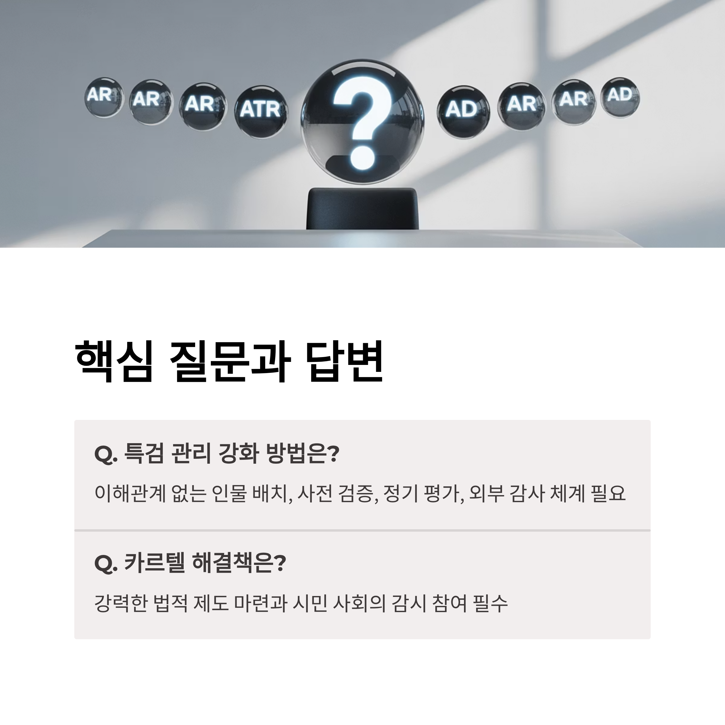 A. 특검 내부의 독립성 보장을 위해 이해관계 없는 인물의 배치와 사전 검증, 정기적인 내부 평가가 필수적입니다. 또한, 외부 감사와 국민 참여 모니터링 체계를 추가하는 것도 효과적입니다.