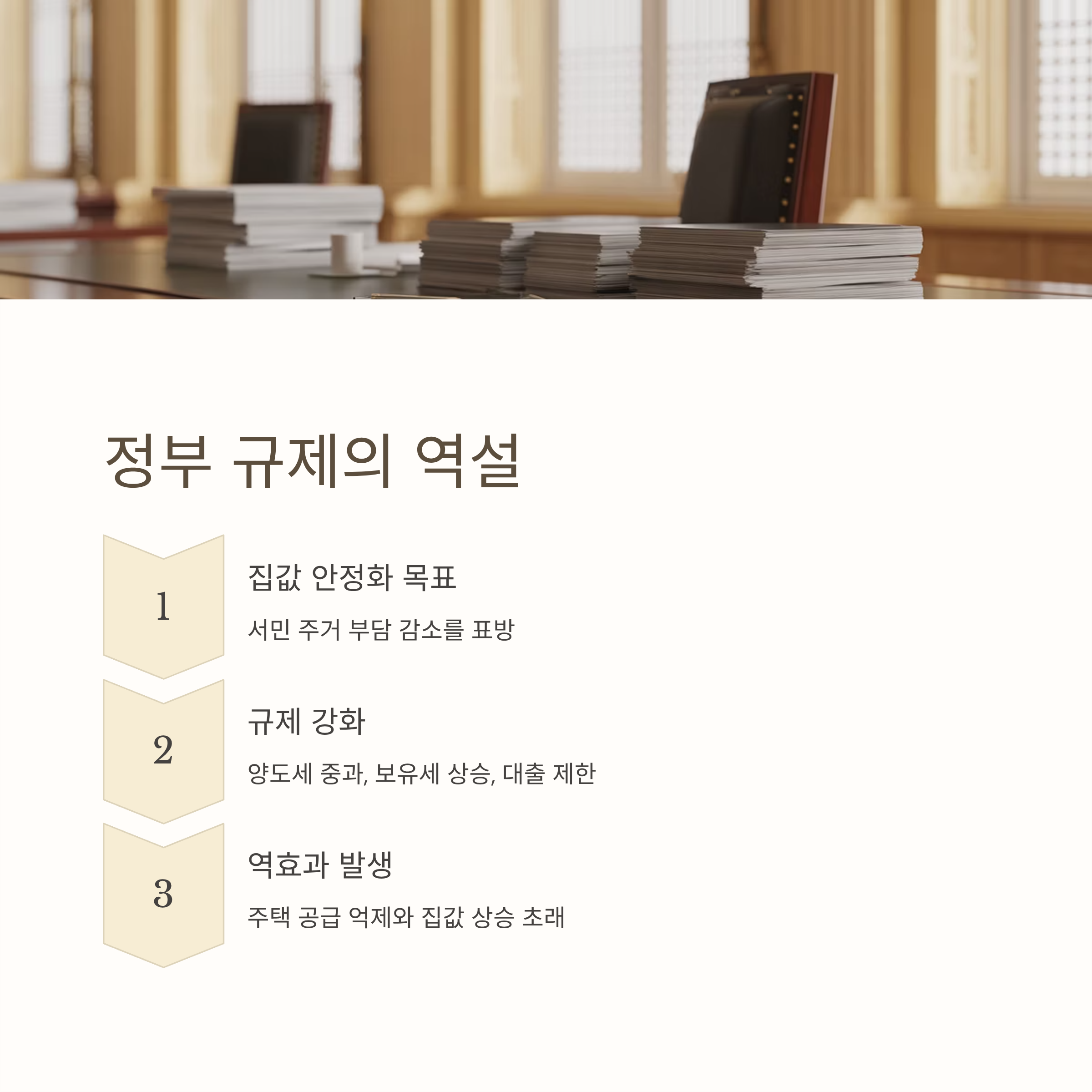 정부의 부동산 정책은 표면적으로는 집값 안정화와 서민 주거 부담 감소를 목표로 하고 있다. 그러나 현실에서는 다주택자 억제라는 방향성 아래 이루어진 규제들이 역효과를 초래하고 있다. 특히 양도소득세 중과, 보유세 상승, 대출 규제 등은 시장 민감도를 고려하지 않고 일괄적으로 적용되면서, 오히려 주택 공급 억제와 집값 상승의 원인이 되고 있다. 이는 정책이 의도와 다른 방향으로 흘러갔음을 의미한다.