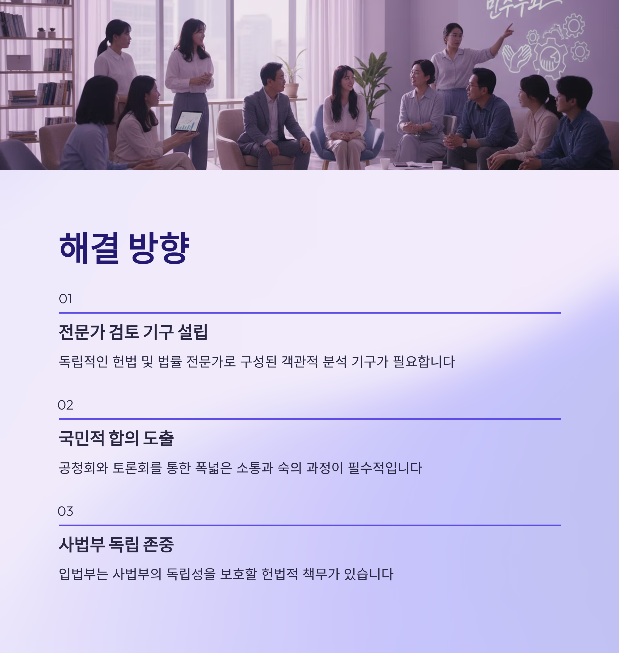 • 헌법적 쟁점: 법률 개정은 국가 기관의 독립성을 전제로 해야 한다는 헌법적 요청을 위반할 소지가 있으며, 위헌 심판이나 헌법 소원으로 이어져 장기적인 법적 혼란을 초래할 수 있습니다.