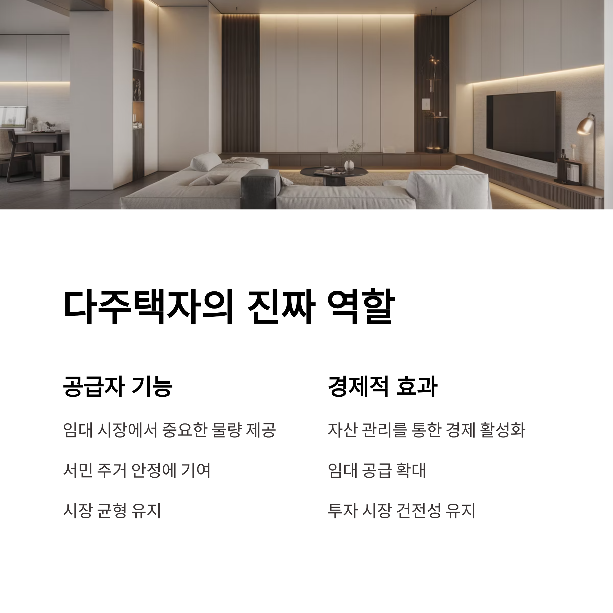 최근 다주택자 논란에서 가장 많이 간과되는 부분은 다주택 보유가 실제 경제에 미치는 긍정적 역할입니다. 다주택자는 단순히 '투기꾼'으로 치부되기보다는 주택 시장에서 중요한 공급자로 기능합니다. 특히 임대 시장에서 다주택자가 제공하는 임대 물량은 서민들의 주거 안정에 매우 중요한 역할을 합니다. 한 가지 예를 들자면, 정부의 규제로 인해 다주택자들이 매물을 대거 처분하면 단기적으로는 임대 공급이 축소되고, 임대료가 상승할 가능성이 높아집니다. 결국 이는 임차인들에게 직접적인 부담으로 작용합니다. 시장의 자율성을 보장하면서 다주택자의 역할을 긍정적으로 평가하여 정책을 설계할 필요성이 있습니다.