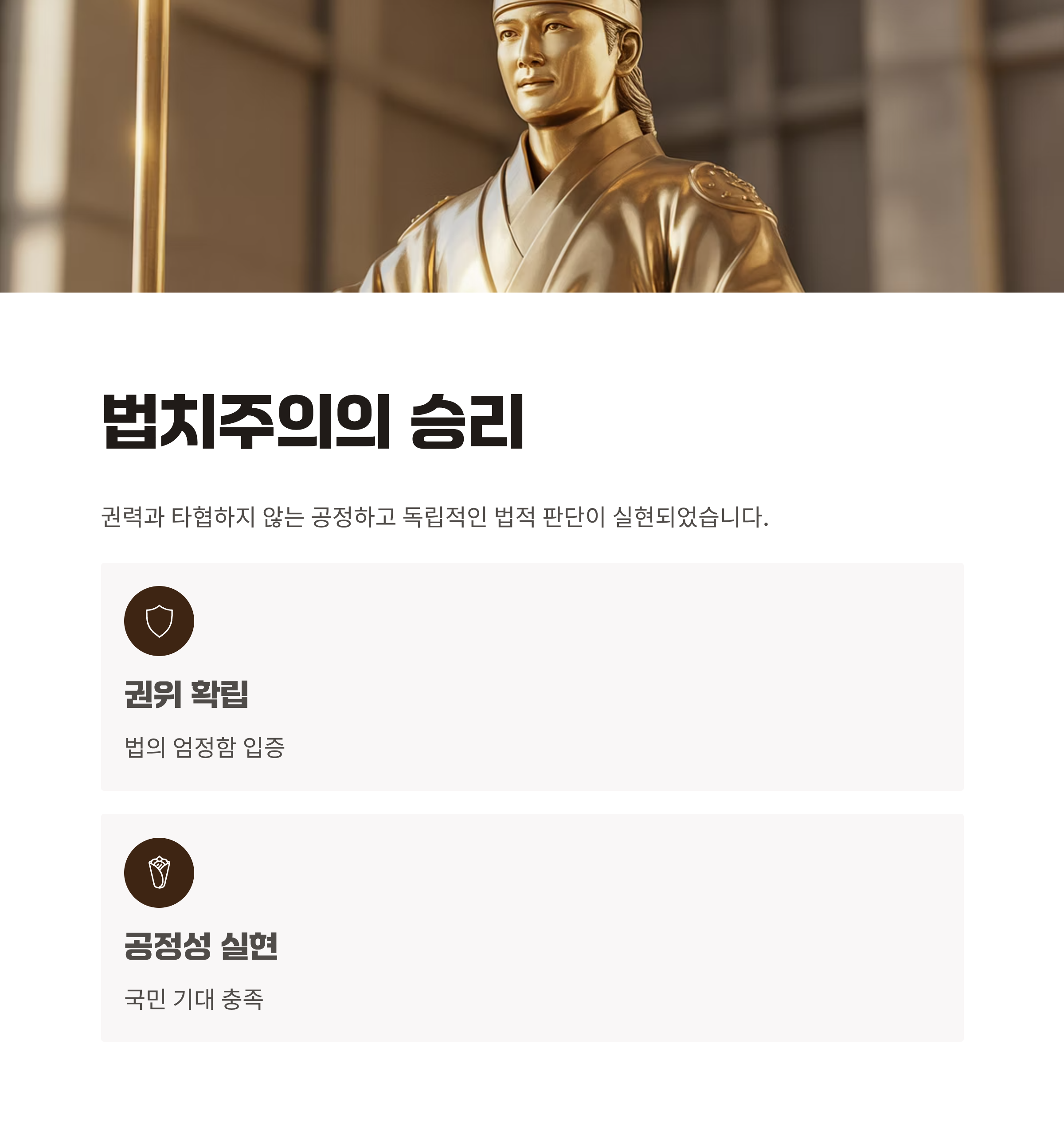 법치는 그 어떤 경우에도 타협의 대상이 될 수 없습니다. 이번 사건은 법이 가진 권위와 동시에 국민의 기대를 충족시키는 공정성을 보여주는 계기가 되었습니다. 국민과 사법부가 함께 정의 구현을 위해 나아갈 때, 이와 같은 판결이 대한민국의 미래를 밝힐 것입니다.