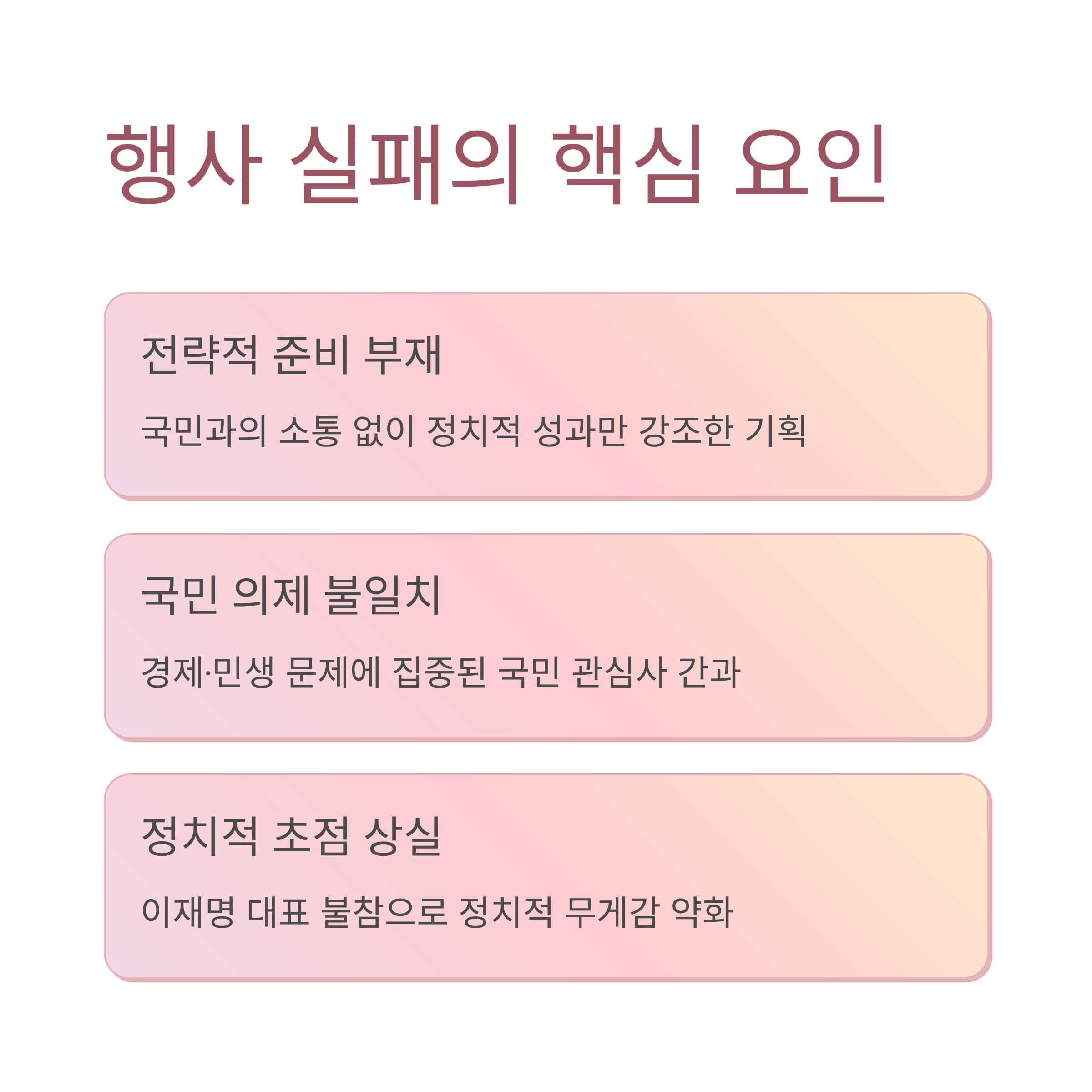 결론적으로 이번 사례는 정치 행사에서 대중과의 소통 부족의 사례로 평가됩니다.