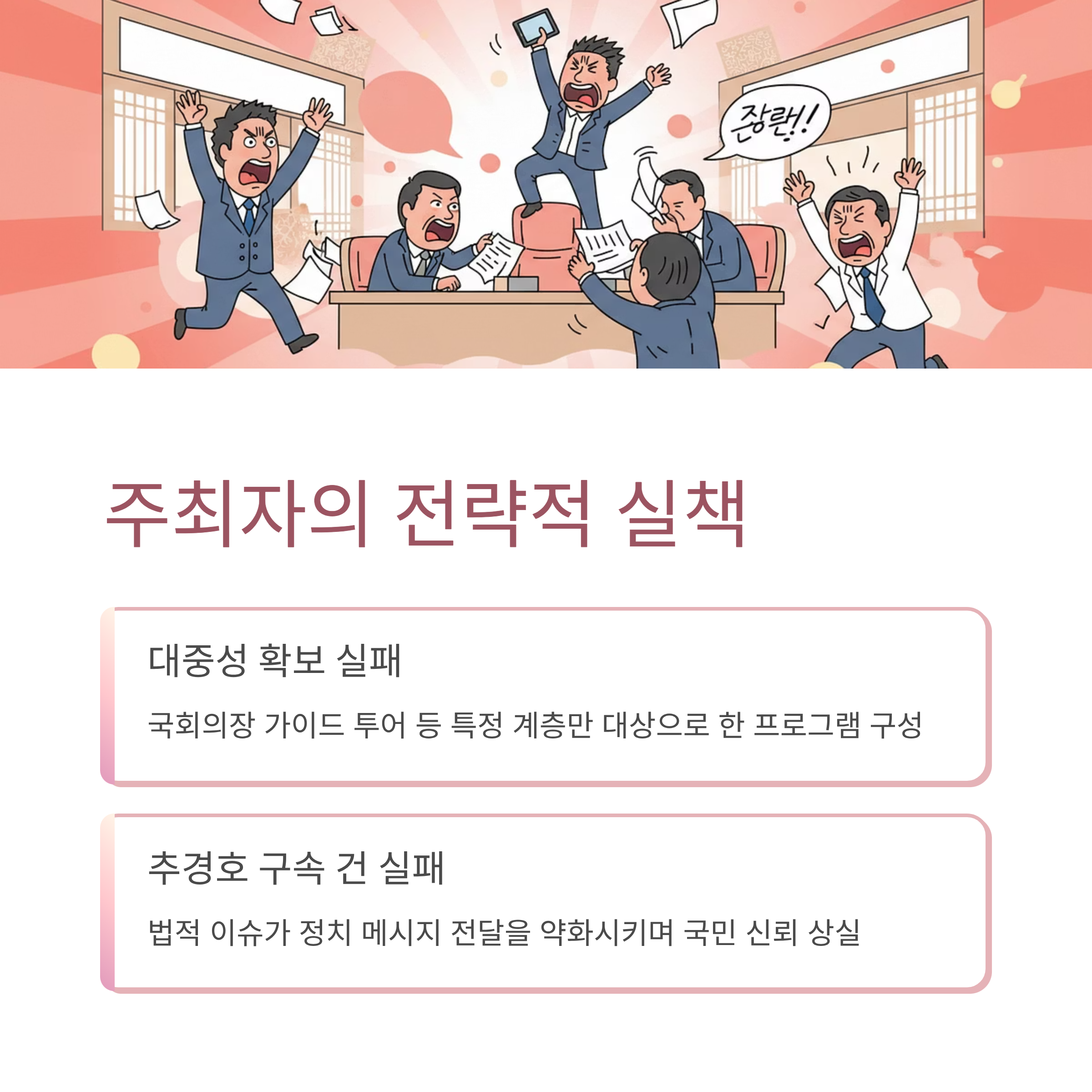 계엄 1주년 행사는 정치적 성과를 강조하려는 목적이 강했습니다. 그러나 이번 행사는 국민의 일상적인 관심사와는 거리가 멀어, 대중성을 확보하지 못했습니다. 예를 들어, 국회의장 가이드 투어 같은 프로그램은 특정 계층을 대상으로만 한정되는 성격을 띠었고, 국민과의 실질적 소통을 기대하기 어렵다는 평가를 받았습니다. 또한 추경호 의원 구속 건 실패는 행사 준비의 권위와 명분을 약화시키는 결정적 계기가 되었습니다. 법적 이슈가 의도된 정치 메시지를 전달하는 데 있어서 역사적 실수를 초래했으며, 이로 인해 국민적 신뢰를 잃는 결과로 이어졌습니다.
