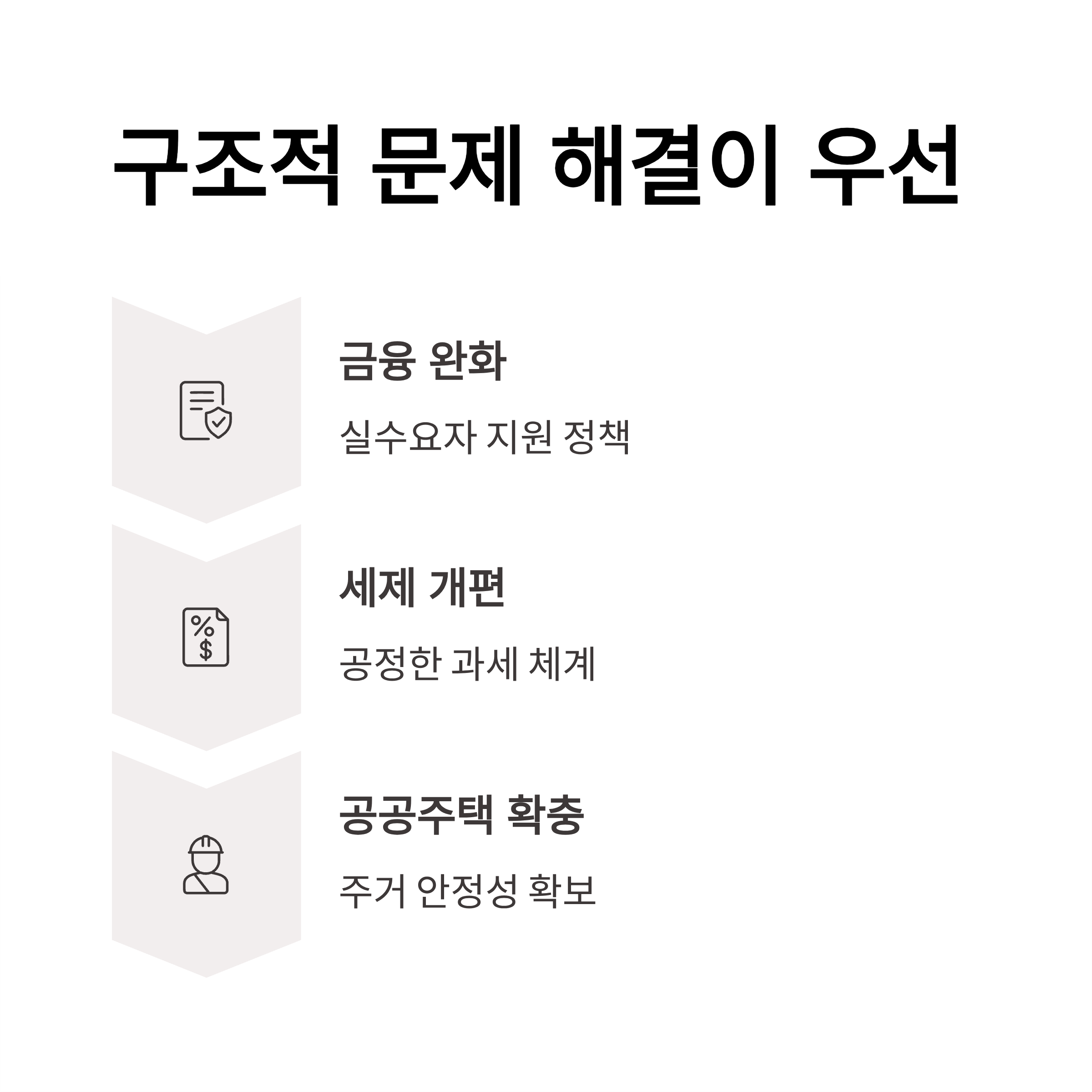 | A. 감정적 정치 논쟁을 지양하고, 금융 완화, 세제 개편, 공공주택 확충 등 실질적인 정책적 접근이 필요합니다. |