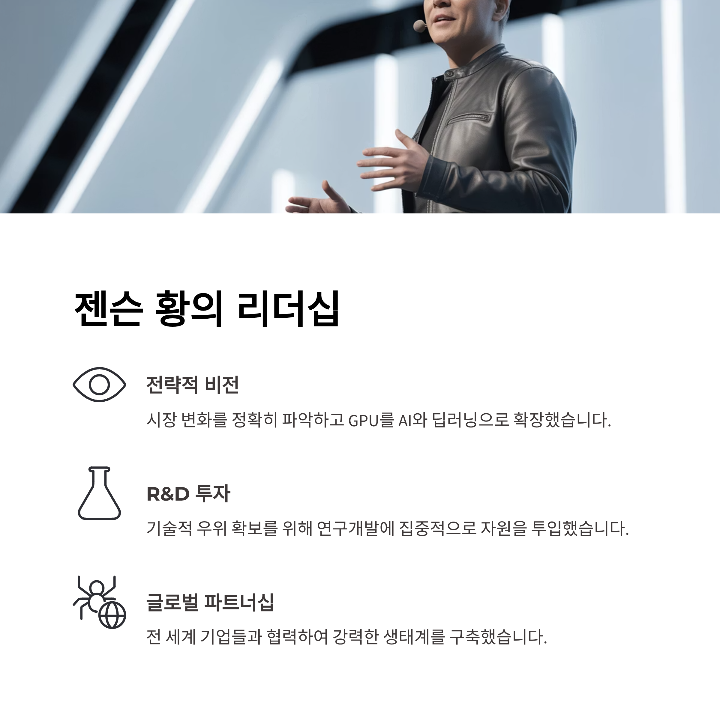 젠슨 황은 기술 혁신에 대한 높은 열정과 전략적 사고를 바탕으로 엔비디아를 주도해 왔습니다. 그는 시장의 변화를 정확히 파악하고, GPU의 역할을 단순한 그래픽 처리에서 AI, 딥러닝에 이르는 기술로 확장하며 새로운 시장을 창출했습니다. 특히, 젠슨 황은 R&D 투자에 우선순위를 두며 기술적 우위를 확보하는 데 많은 자원을 집중했습니다. 그는 또한 글로벌 파트너십 구축에 강점이 있었습니다. 한국의 삼성전자와 협력하여 메모리 기술을 접목한 엔비디아 GPU는 시장에서 높은 평가를 받았으며, 이를 통해 전 세계 소비자들에게 더욱 강력한 성능을 제공할 수 있었습니다. 젠슨 황의 리더십은 단기적인 성과보다는 장기적인 시장 선점을 목표로 했다는 점에서 큰 주목을 받았습니다.