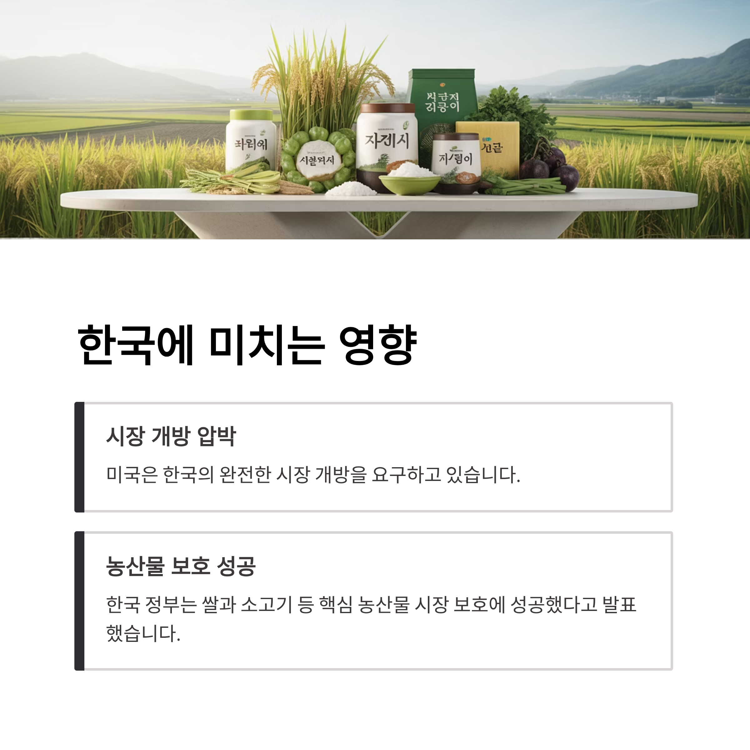 3. 한국과 관련하여 미국은 시장 완전 개방 합의를 언급하나, 한국 정부는 쌀과 소고기 등 농산물 시장 보호에 성공했다고 주장.