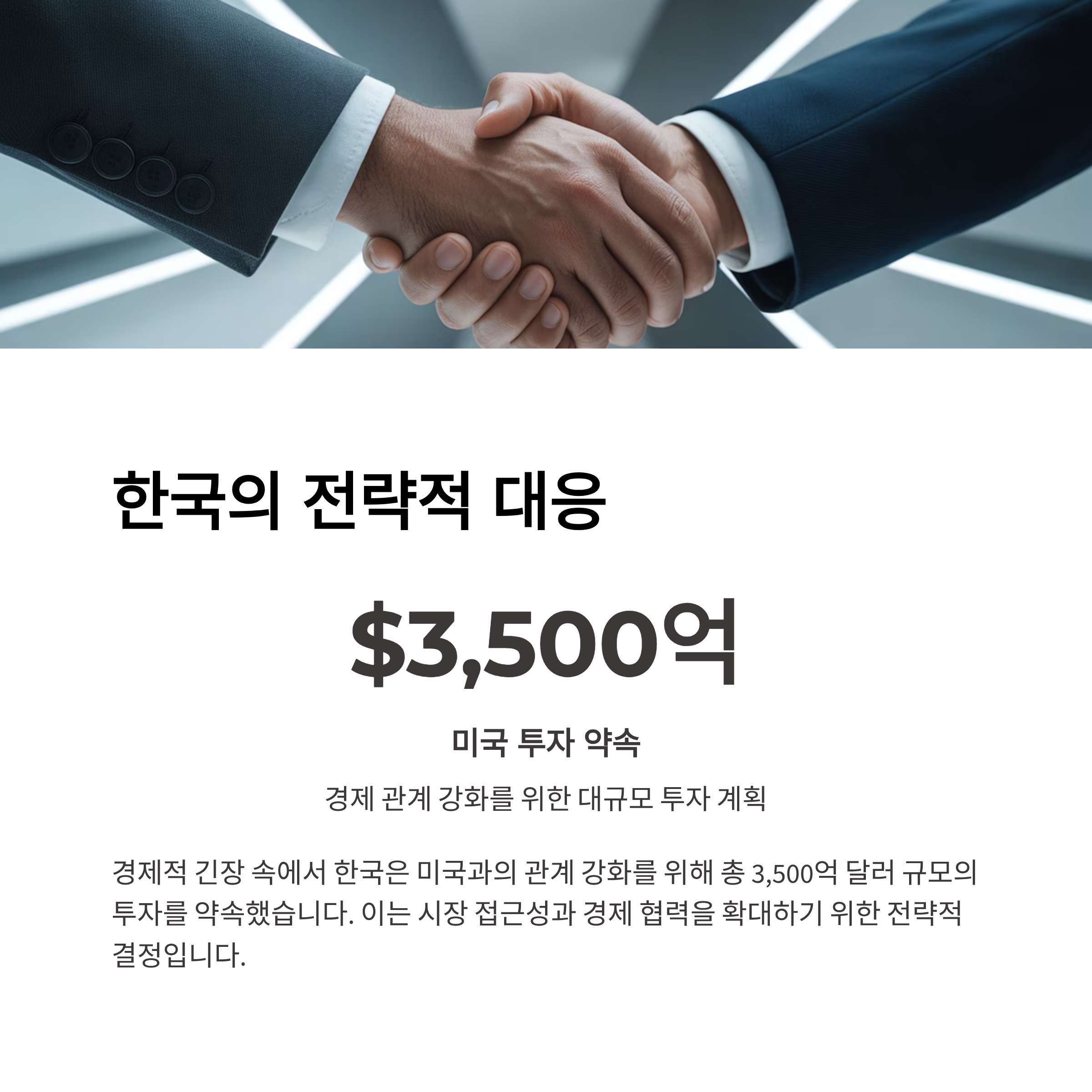 4. 경제적 긴장 속에서 한국은 미국에 총 3,500억 달러 규모의 투자 계획을 약속해 시장과 관계 강화를 도모.