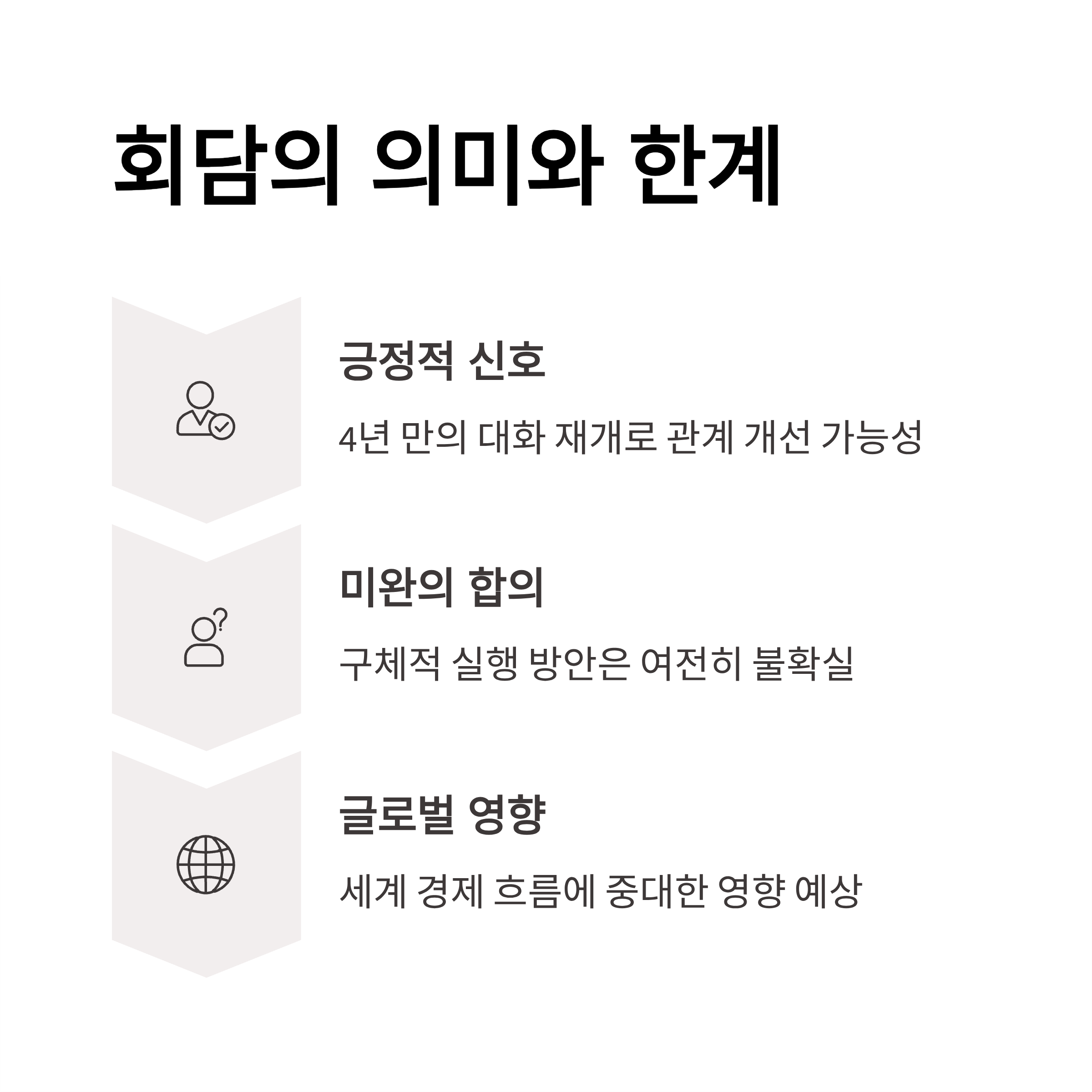 | A. 양국 모두 단기적 이익에 집중한 합의를 도출했으며, 근본적으로 해결되지 않은 갈등 요소가 많아 회담 성과의 지속성은 불확실합니다. |